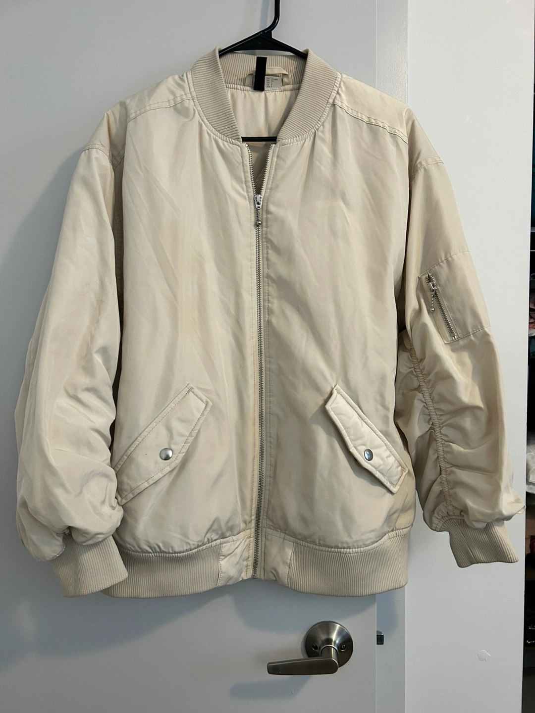 A versatile bomber jacket. Featuring a zip closure and pockets. Ribbed cuffs and hem. A great jacket to wear when the seasons change to stay warm and cozy.