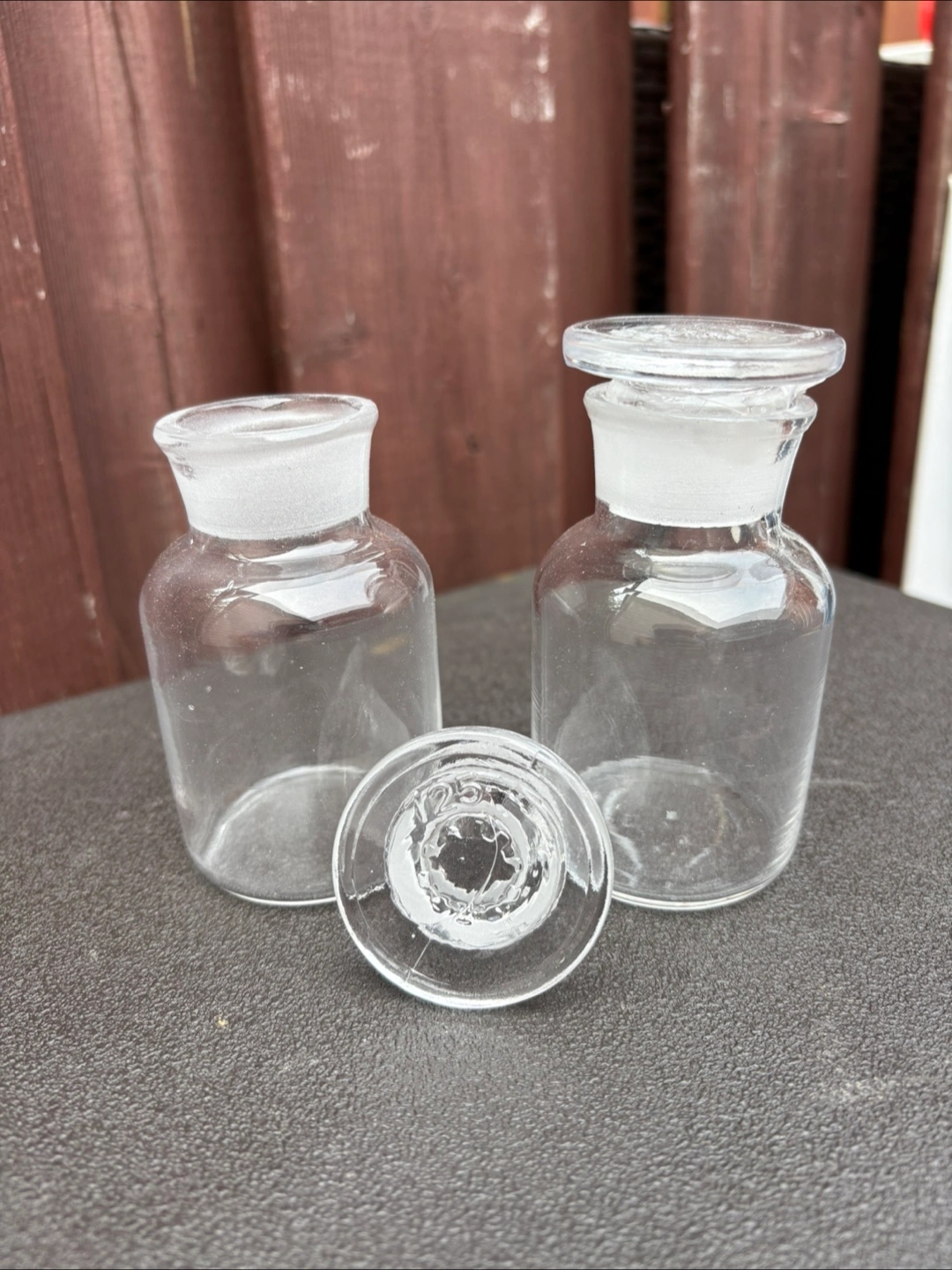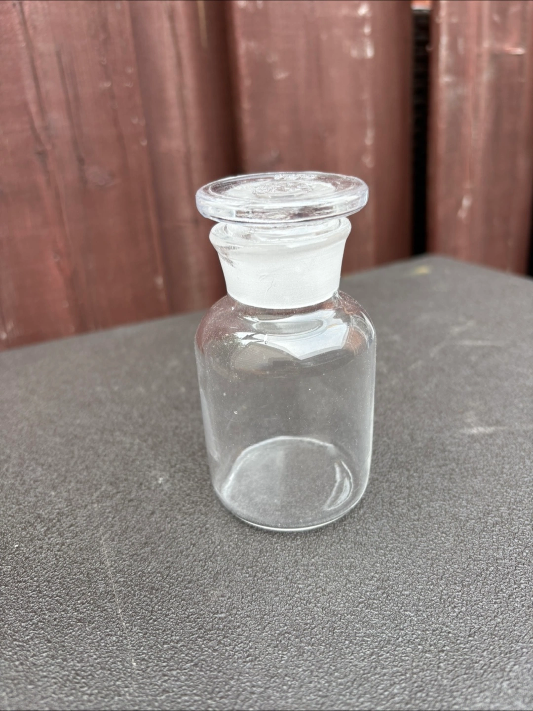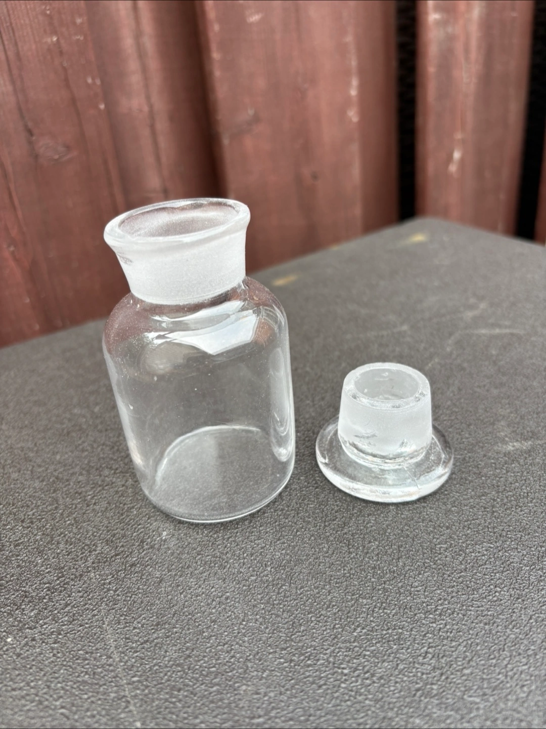 941A small glass bottle with a glass stopper. Clear glass body. The stopper fits snug. This jar could be used to store your favourite essential oils etc. $2 each. I have 13 bottles, $20 for all 13.