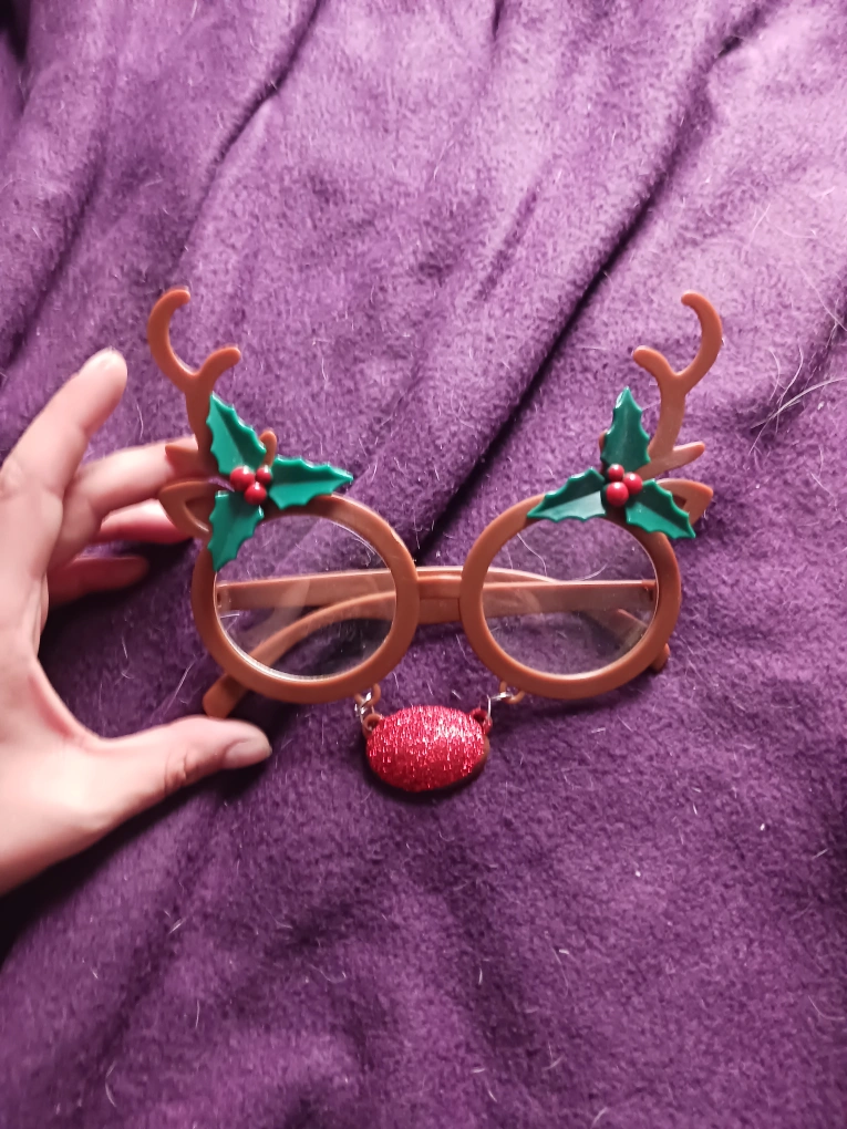 Reindeer glasses with attached antlers and a red nose. Designed with clear lenses and brown frames. A great way to bring festive cheer to any party.