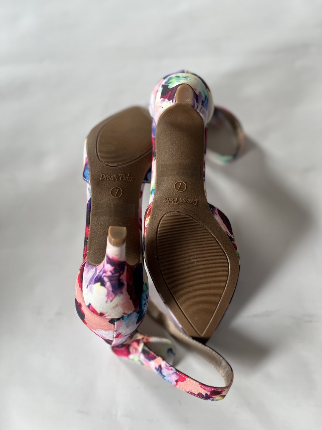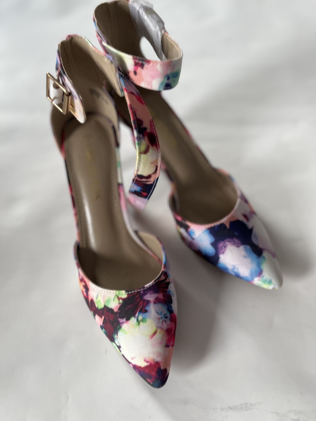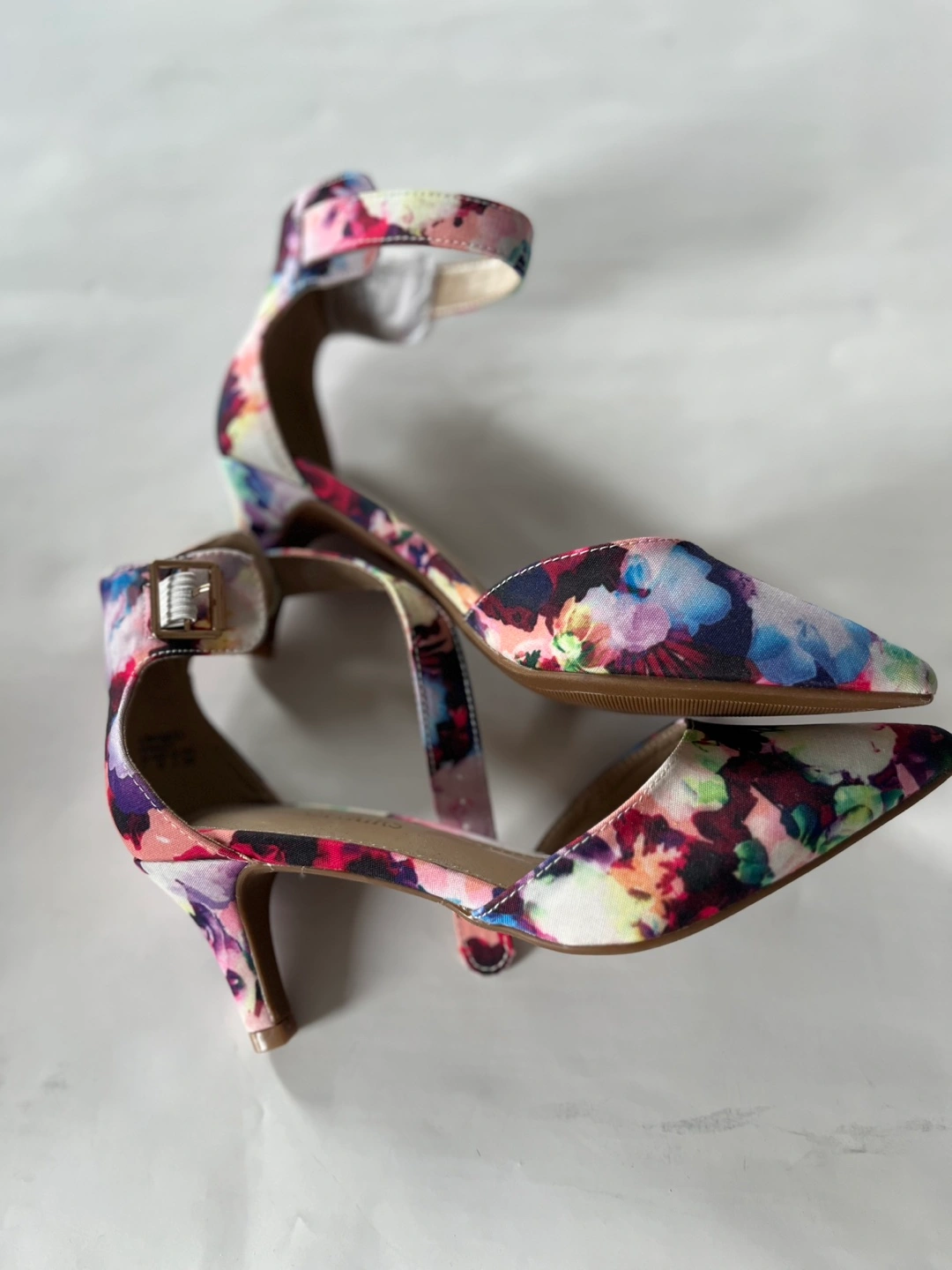 Pointed toe heels. Ankle strap with buckle closure. Floral print all over. These shoes would be wonderful to wear on a special occasion and dance the night away.