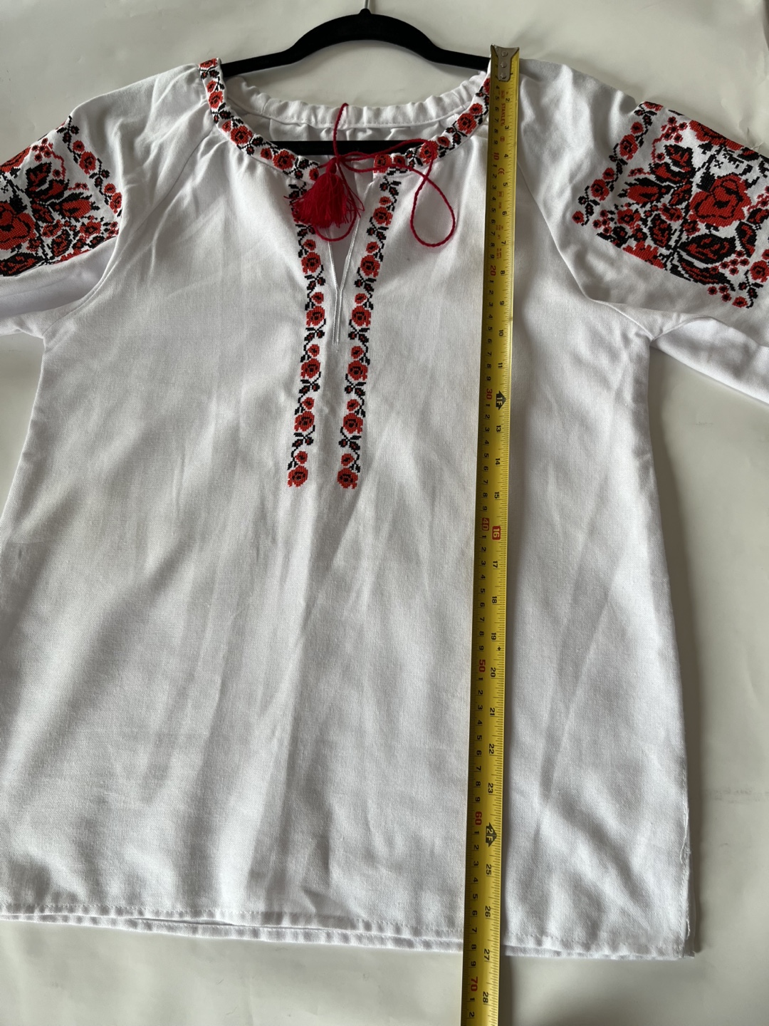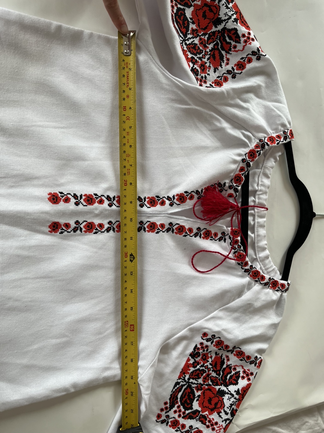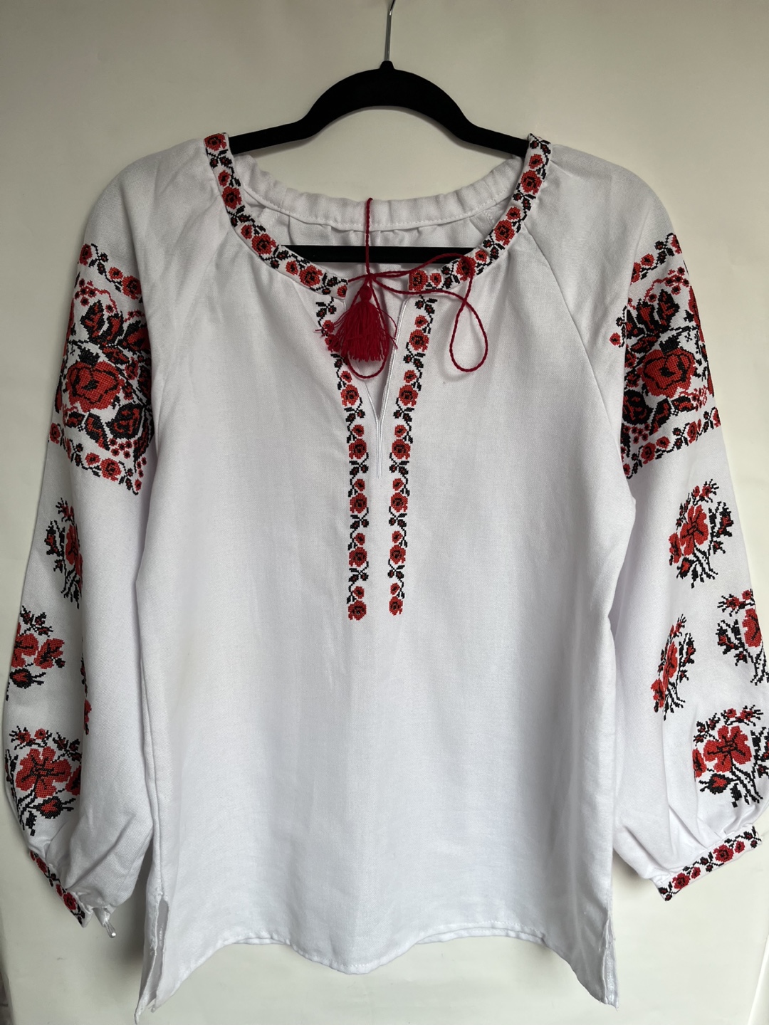 A beautiful white blouse with colorful embroidery, perfect for a casual or formal occasion, bringing some joy into your wardrobe. It has long sleeves. The floral embroidery appears in red and black. Features a tassel at the neckline.