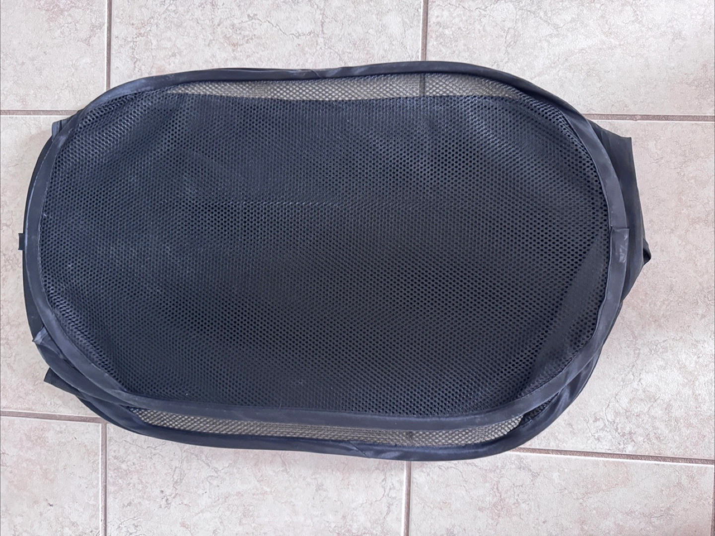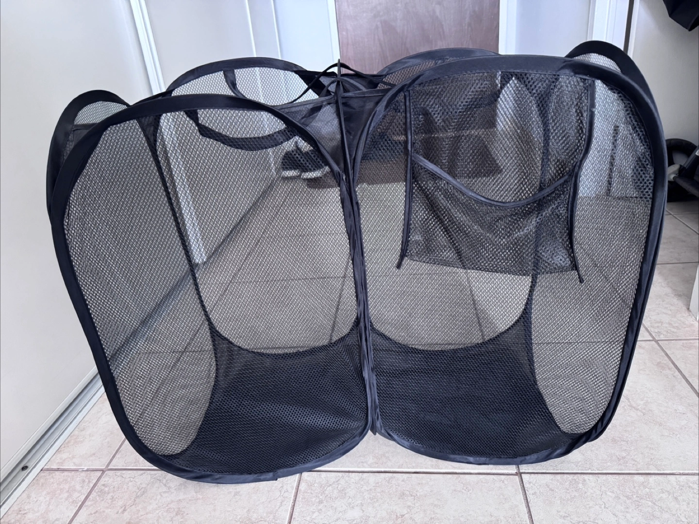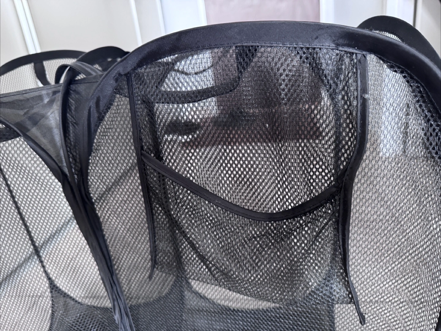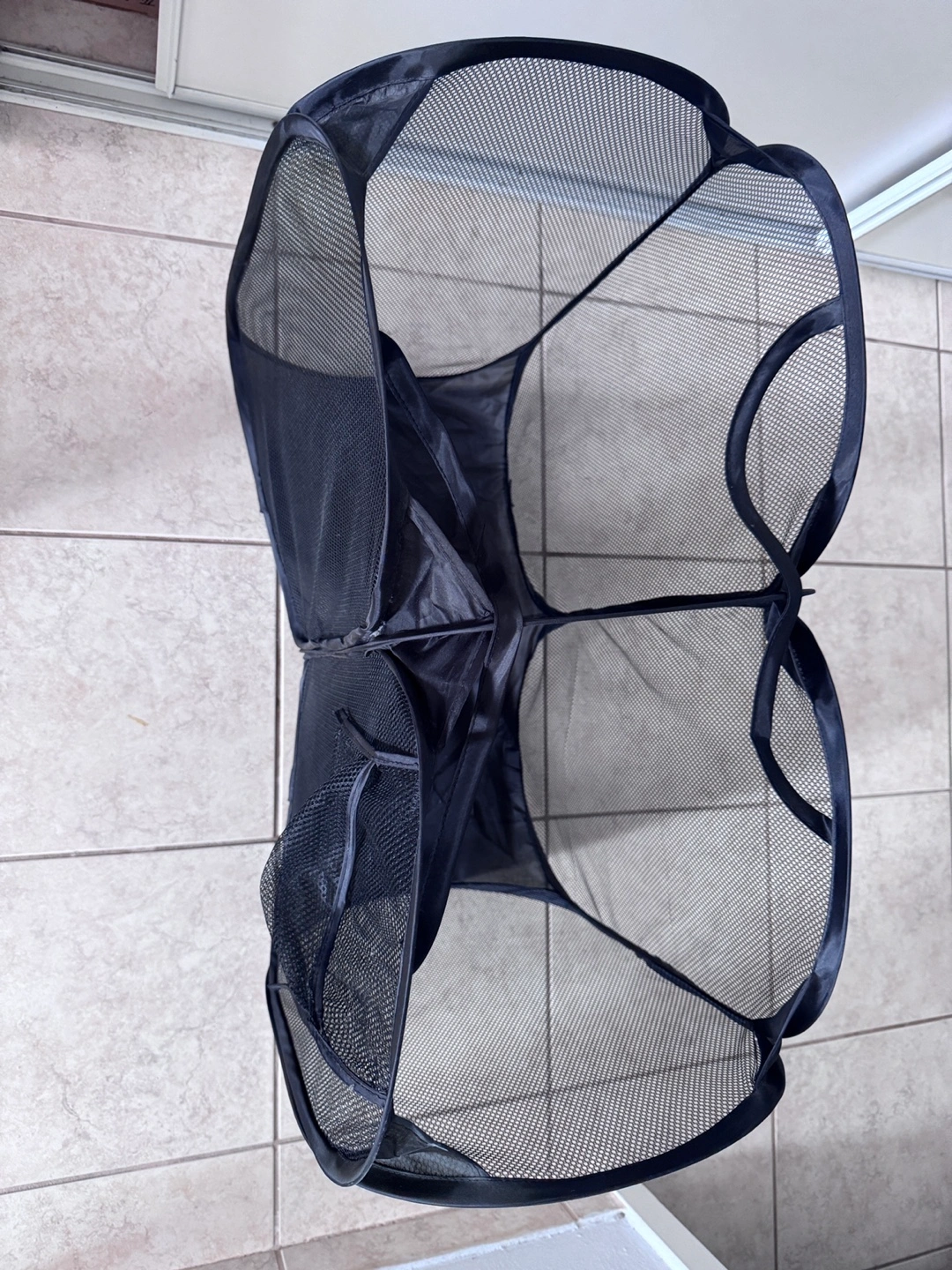 621I have a great mesh laundry hamper. It is made of a durable, dark mesh material. The hamper is in a pop-up style, making it easy to collapse for storage. It features a pocket. It is perfect for organizing your laundry in a peaceful way.