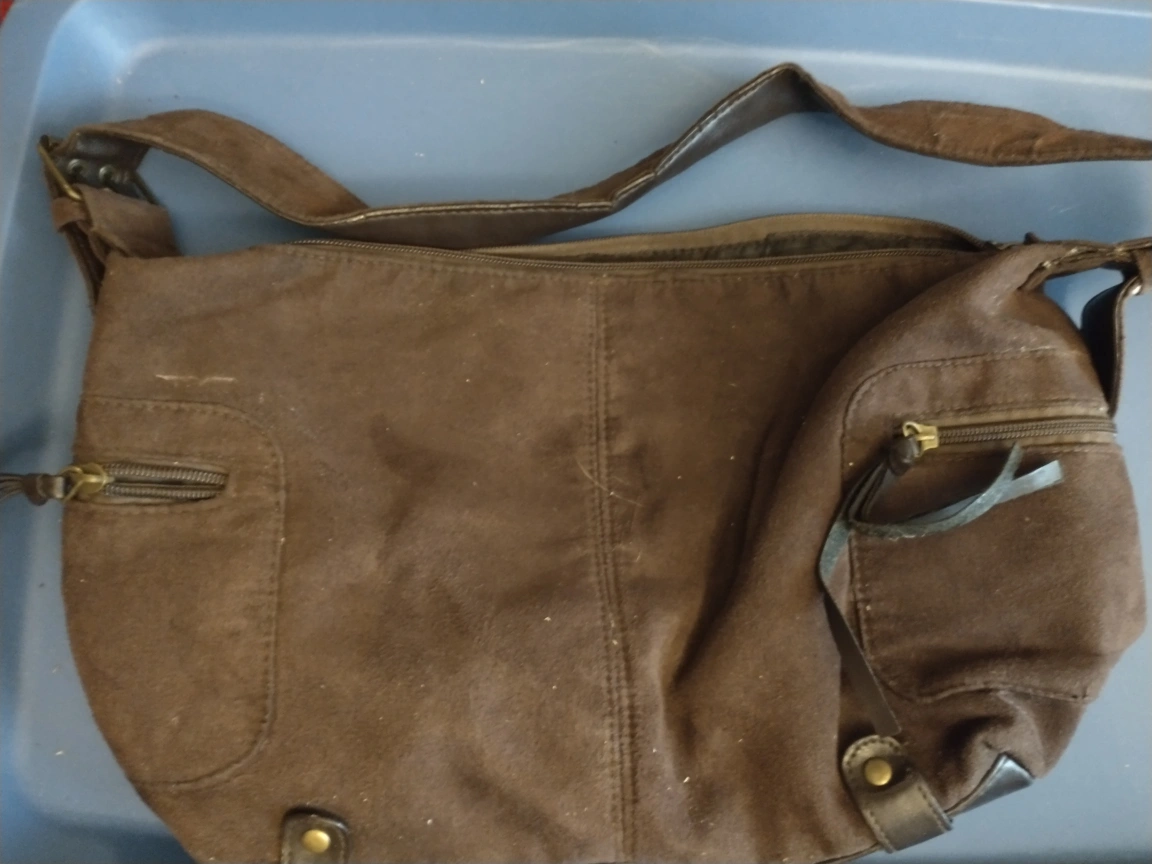 BROWN FAUX SUEDE PURSE. DIMENSIONS ARE 15 IN BY 9 IN X 5 IN WITH A 10-IN DROP. THE INSIDE HAS A ZIPPERED POCKET AND THE ZIPPER STILL WORKS. THE PULL TAB, FOR THE MAIN PART OF THE PURSE, IS MISSING, THE LOOP FOR IT IS STILL THERE SO THAT WOULD BE A QUICK FIX. NO IDEA WHAT HAPPENED TO IT.