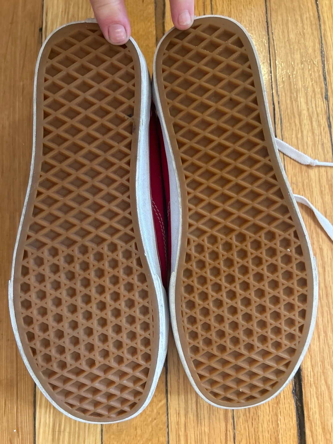 Pair of red sneakers. Features white laces, and a white stripe. The sole is pristine, never worn.