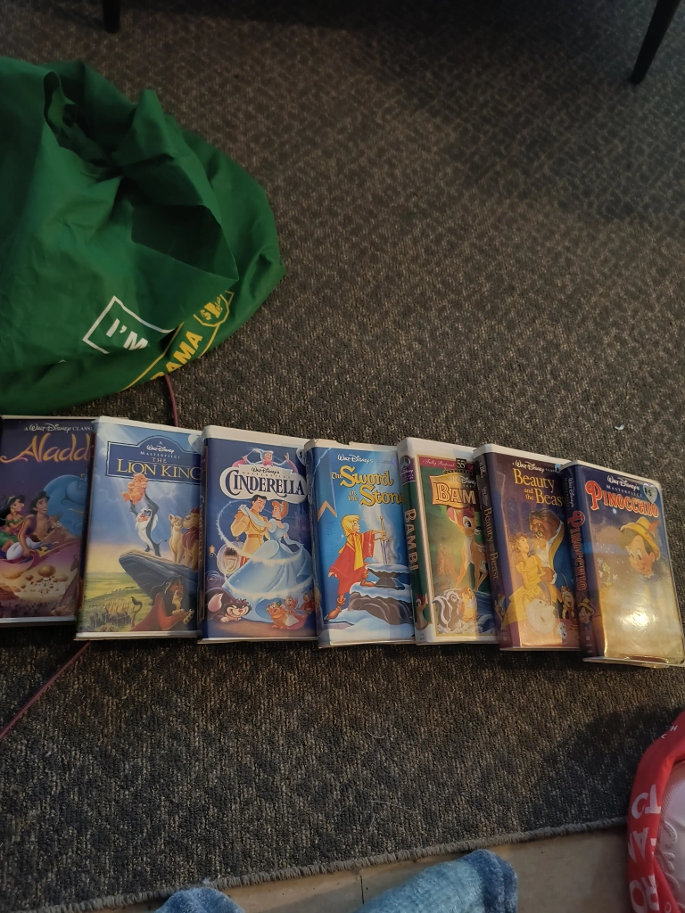 Wonderful collection of Disney VHS tapes. Featuring many classic titles, like Aladdin, The Lion King, and Beauty and the Beast. They would be perfect for a cozy movie night.