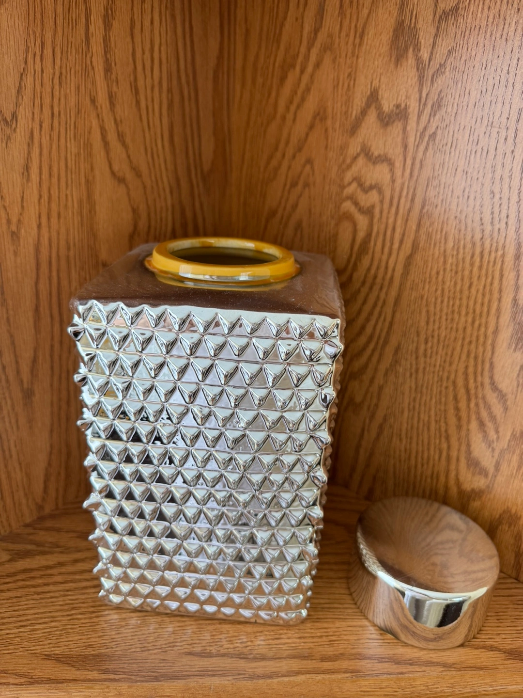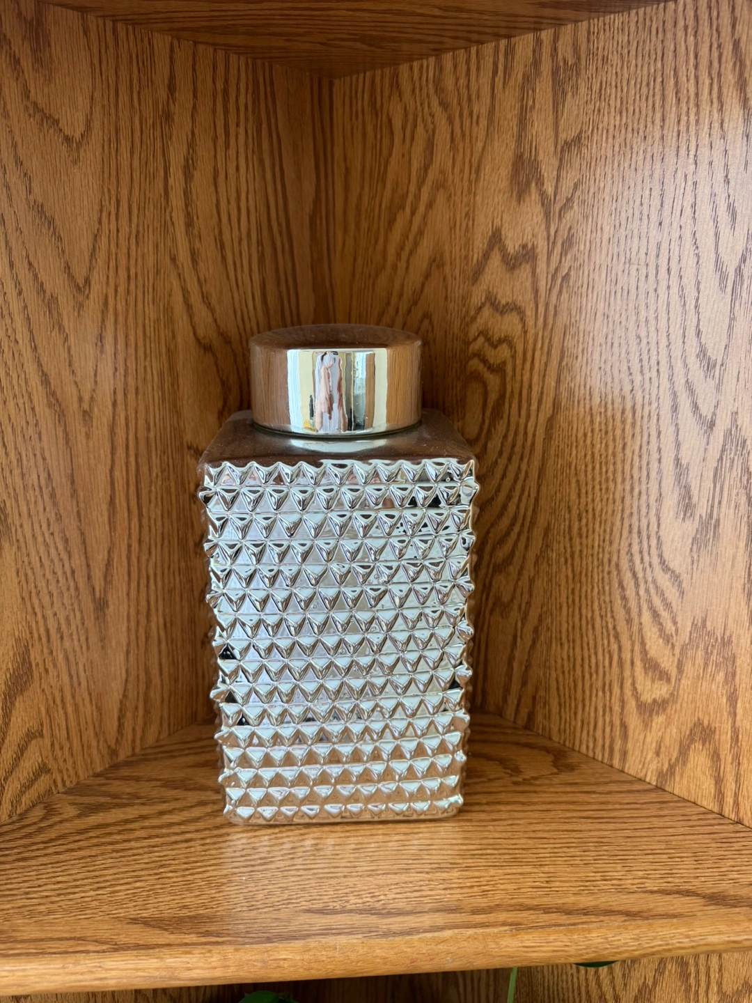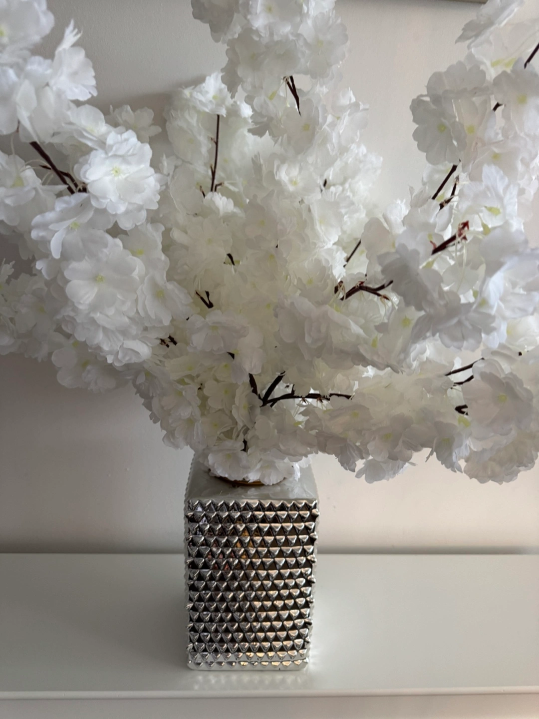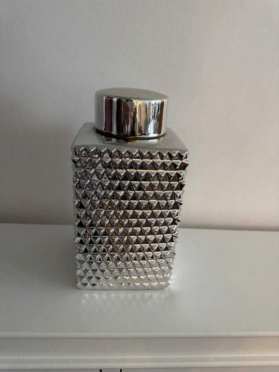 A silver coloured square vase. It features a silver lid. The vase is textured with triangular shapes. It would be lovely to fill with flowers to brighten up a room. FLOWERS ARE NOT INCLUDED