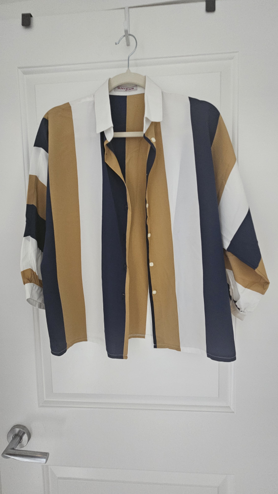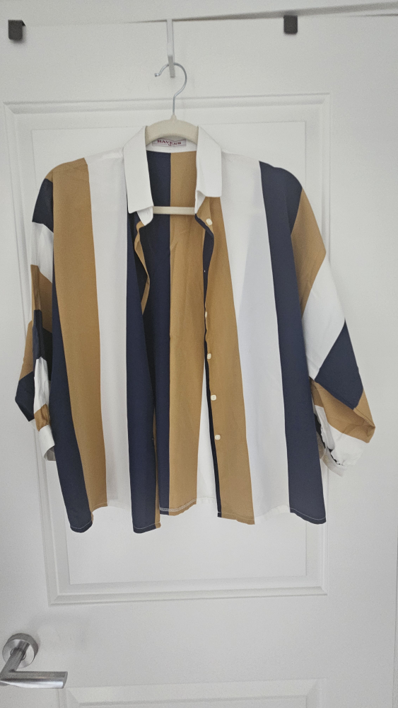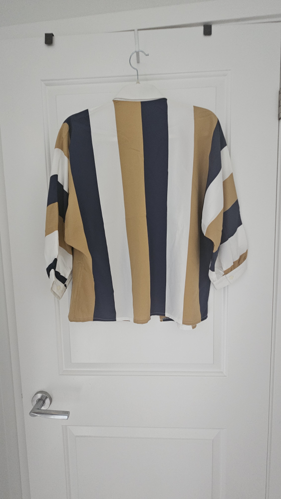 Add a splash of colour to your wardrobe with this stylish Ravens striped blouse! This stylish top features vertical stripes in shades of white, blue, and brown, perfect for a casual or dressed-up look. In very good condition. Vintage charm.