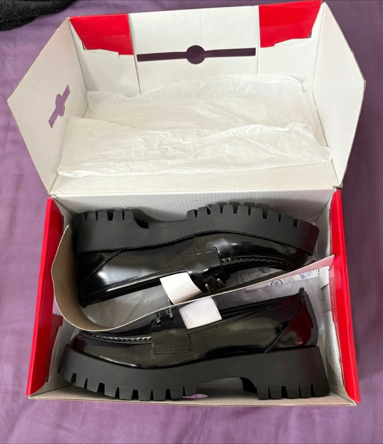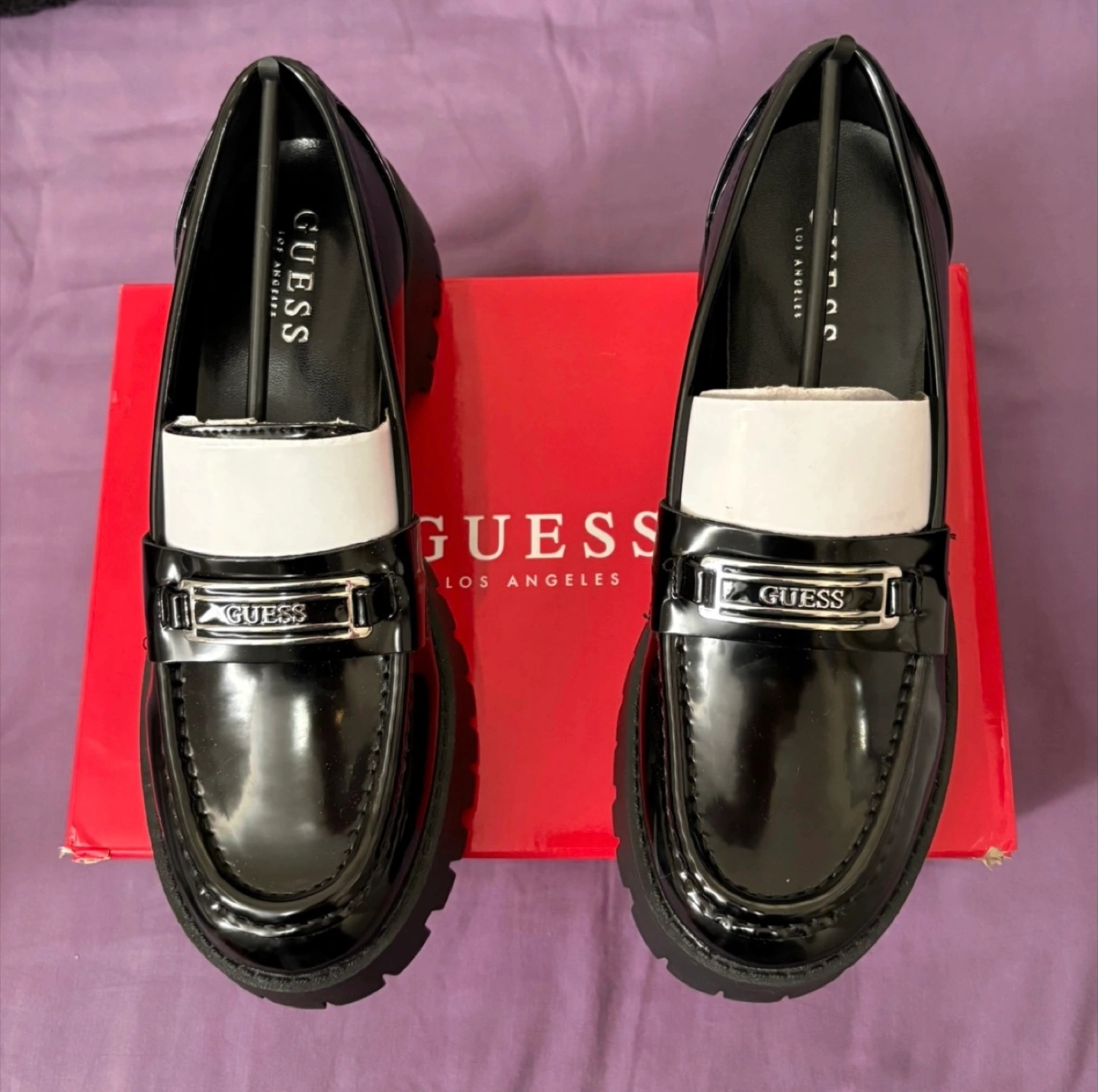 677Women’s Guess Black leather loafer. Chunky sole Silver Guess logo detail New in box Original Price-$74.99 plus Tax- $84.73