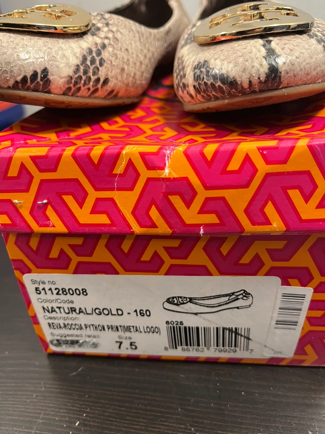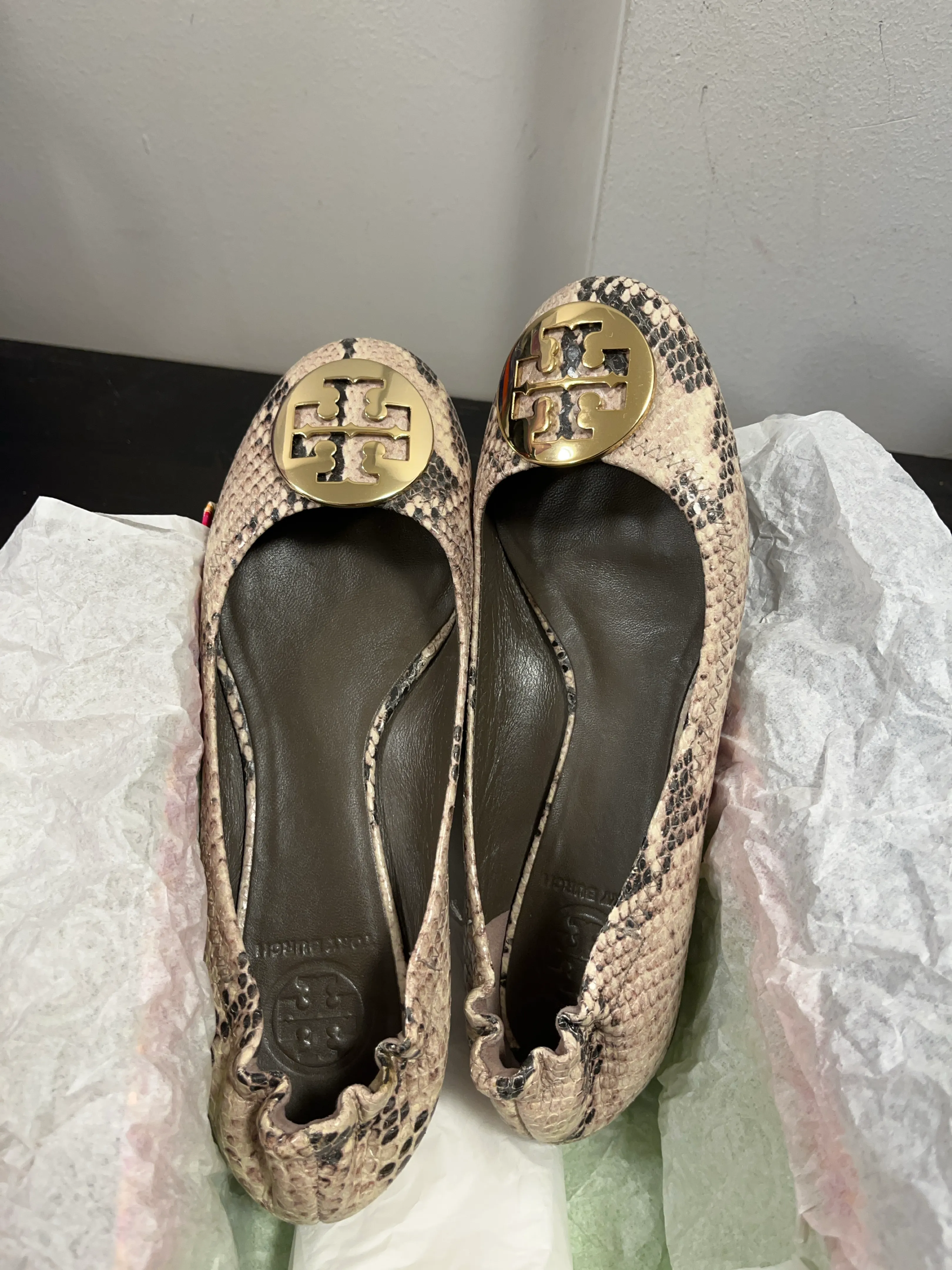 Authentic TB ballet flats. Reptile pattern. Featuring a gold emblem on the front.