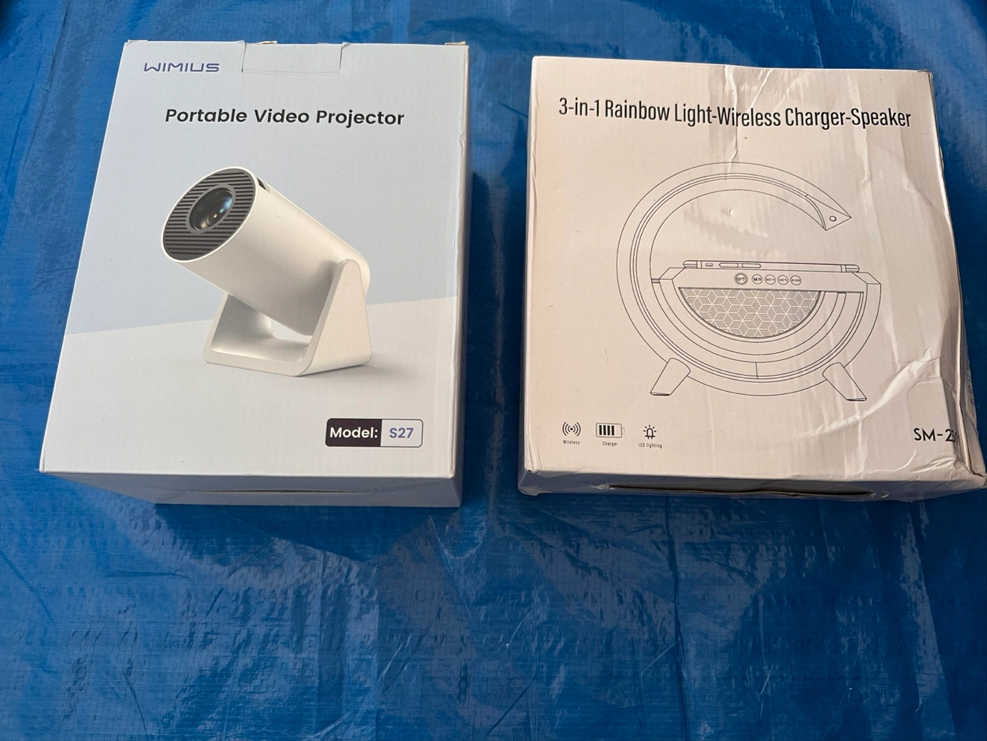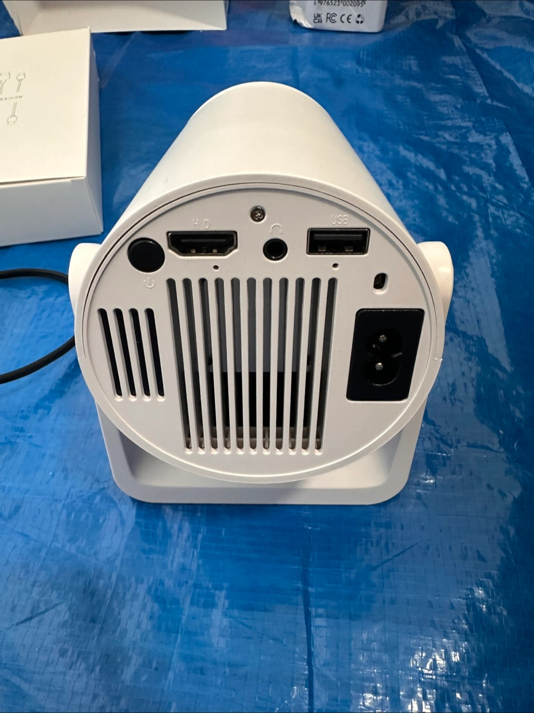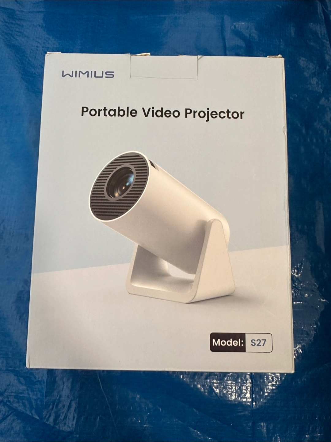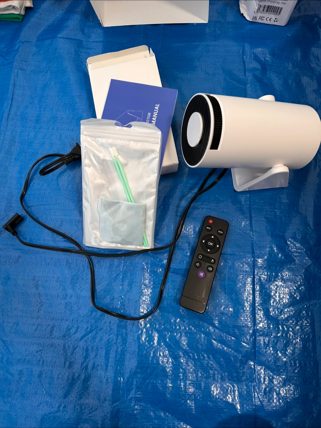 A portable video projector. It comes with its original packaging, a remote control and accessories.