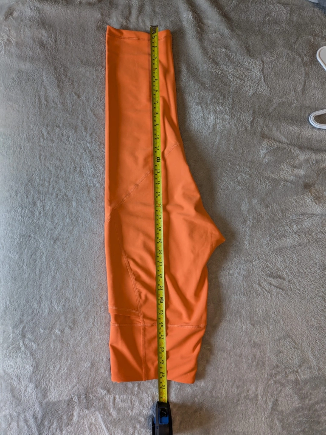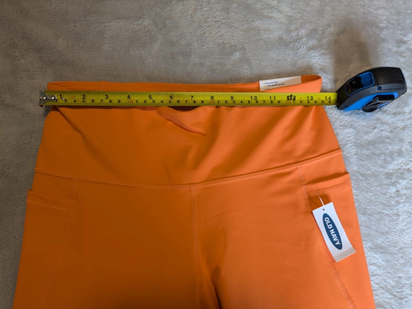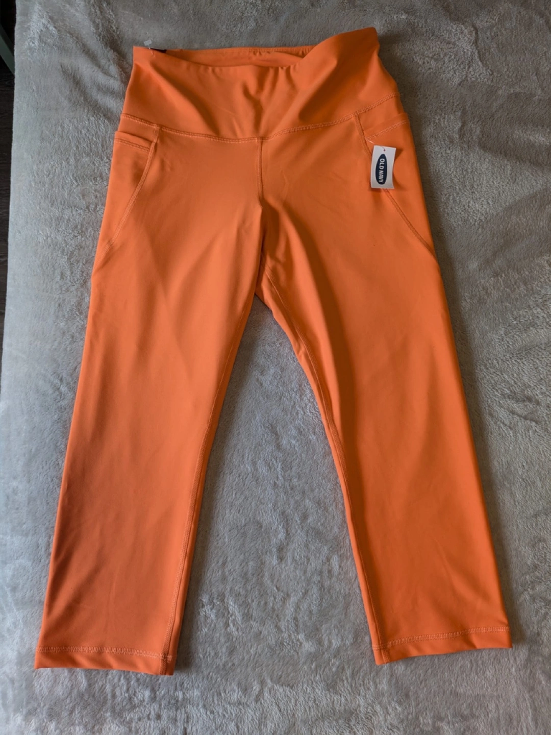 Bright orange leggings. High rise waist. Designed with pockets. Featuring a tag still attached. Great for a relaxing yoga session. These vibrant orange leggings from Old Navy feature a high waistband for added support and a cropped design that ends at the calf. Made from a stretchy, form-fitting material, they offer comfort and ease of movement, making them perfect for athletic activities.
