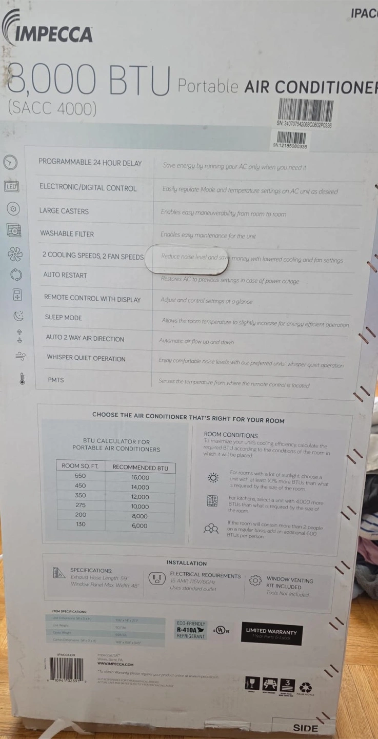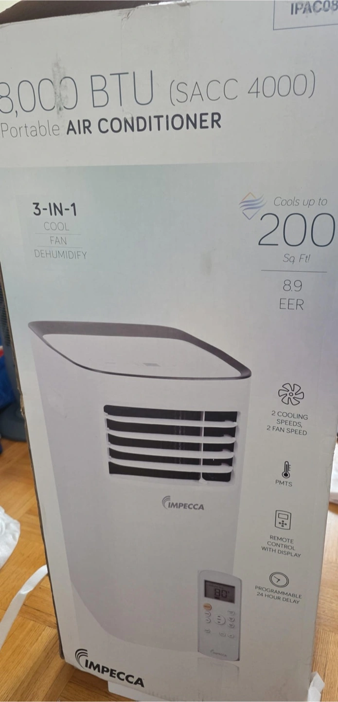 Impecca portable AC 8000 BTUs ( cools up to 200 sq ft) with Remote Control with wheels
