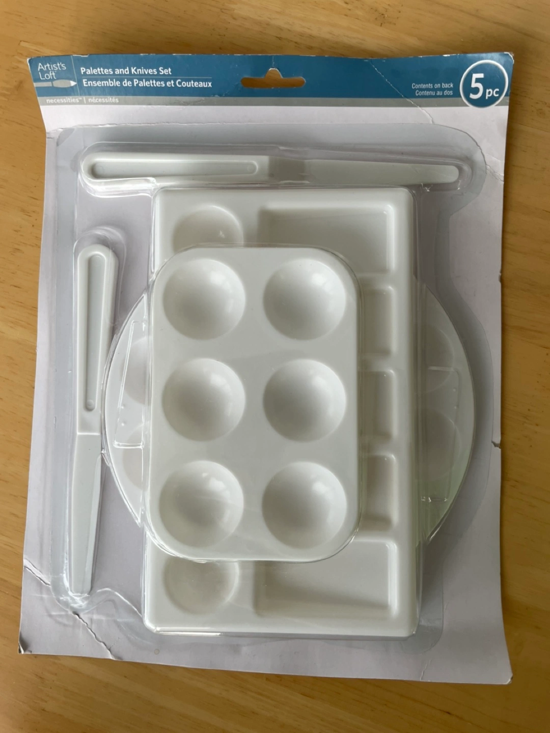 A set of white paint palettes and knives. Still in original packaging. This set would be perfect for a relaxing afternoon of painting.