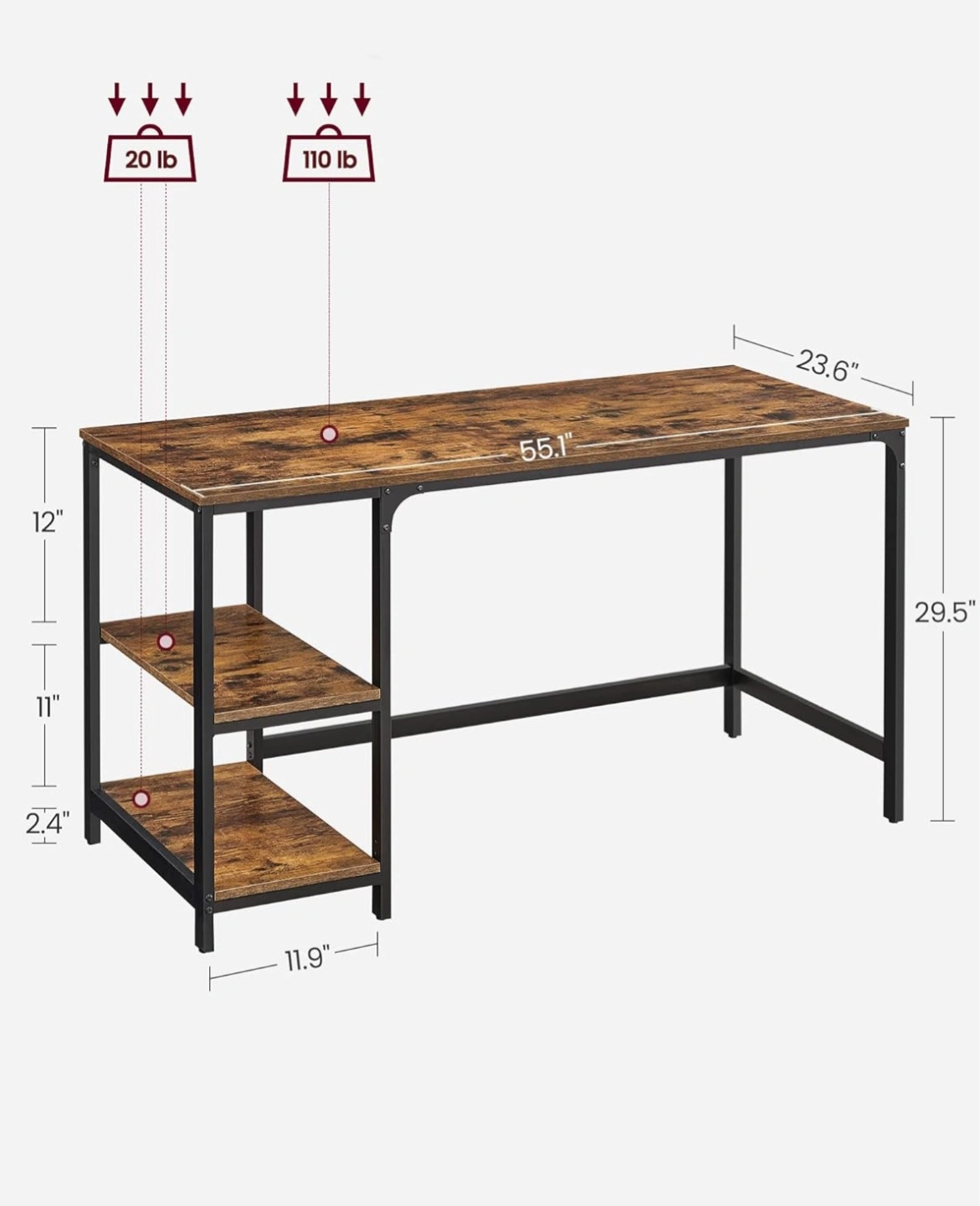 VASAGLE ALINRU Computer Desk, 55.1-Inch Long Home Office Desk for Study, Writing Desk with 2 Shelves on Left or Right, Steel Frame, Industrial, Rustic Brown and Black