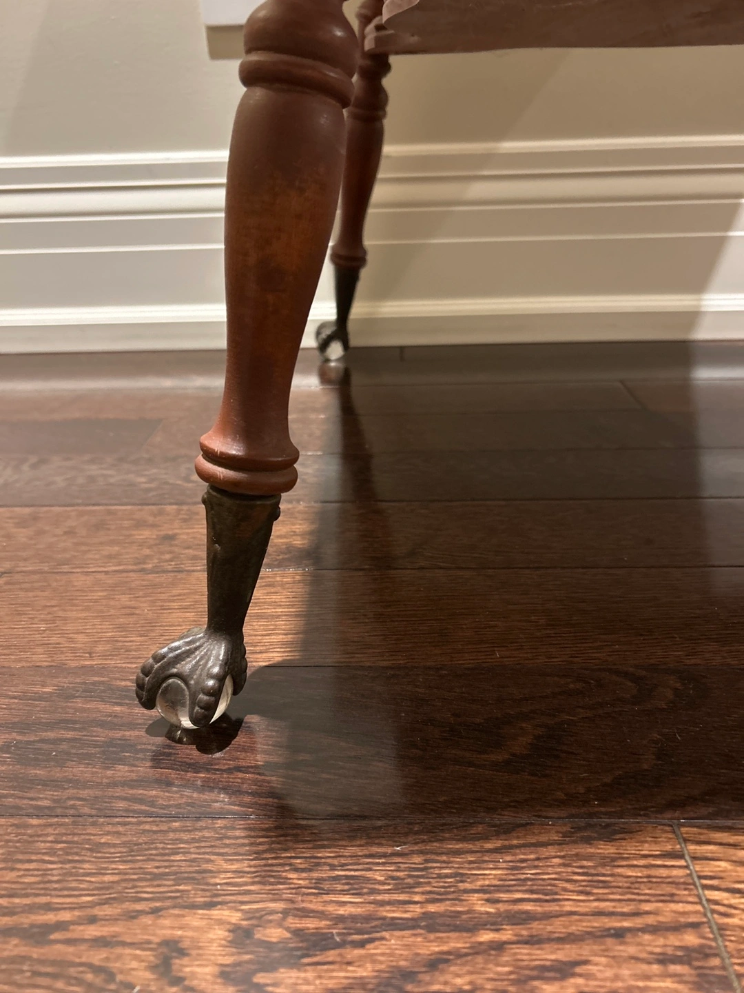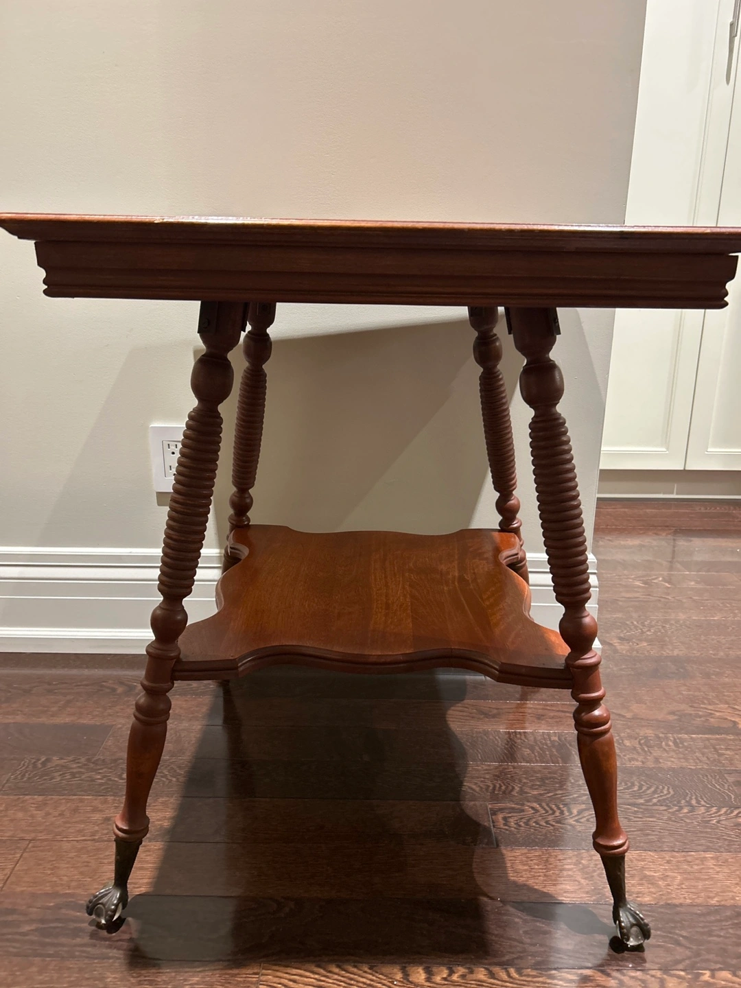 A beautiful wooden Victorian side table. Featuring a two-tiered design. Elaborate legs. Decorative claw feet with glass ball. One small crack on the bottom shelf which is not very noticeable. Perfect to place beside your favourite chair. Very sturdy.