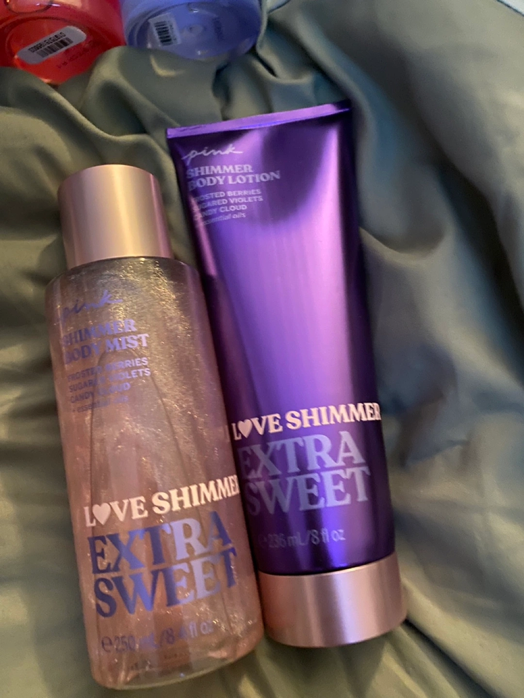 I am selling a Pink Love Shimmer body mist and shimmer body lotion set. The body mist contains frosted berries, sugared violets, and candy cloud. The body lotion has essential oils. Apply these products after a warm shower for an extra dose of relaxation.