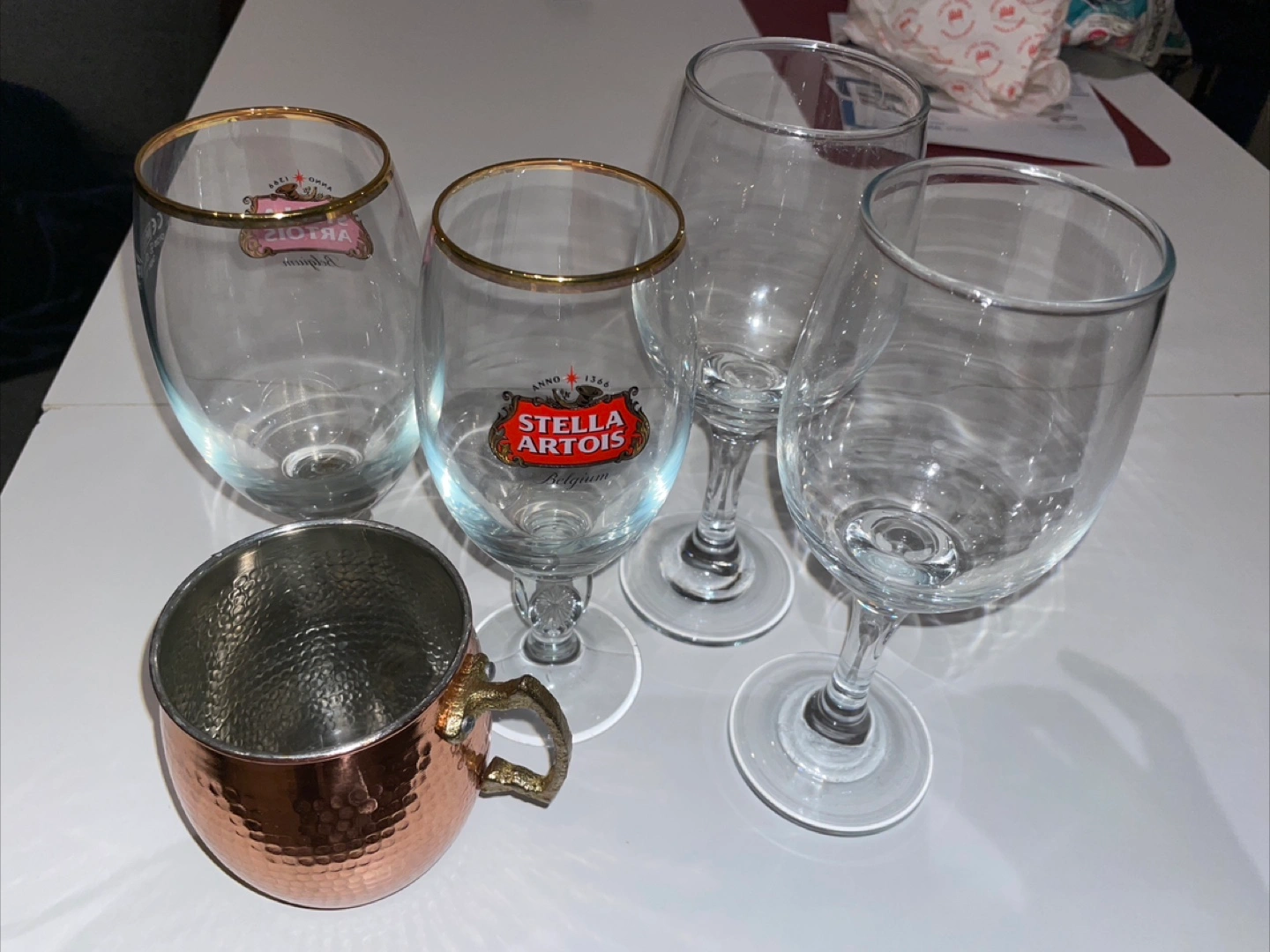 The Stella glasses have decorative gold rims. All glassware are in great condition- no damages or chips. Includes cute metal mug