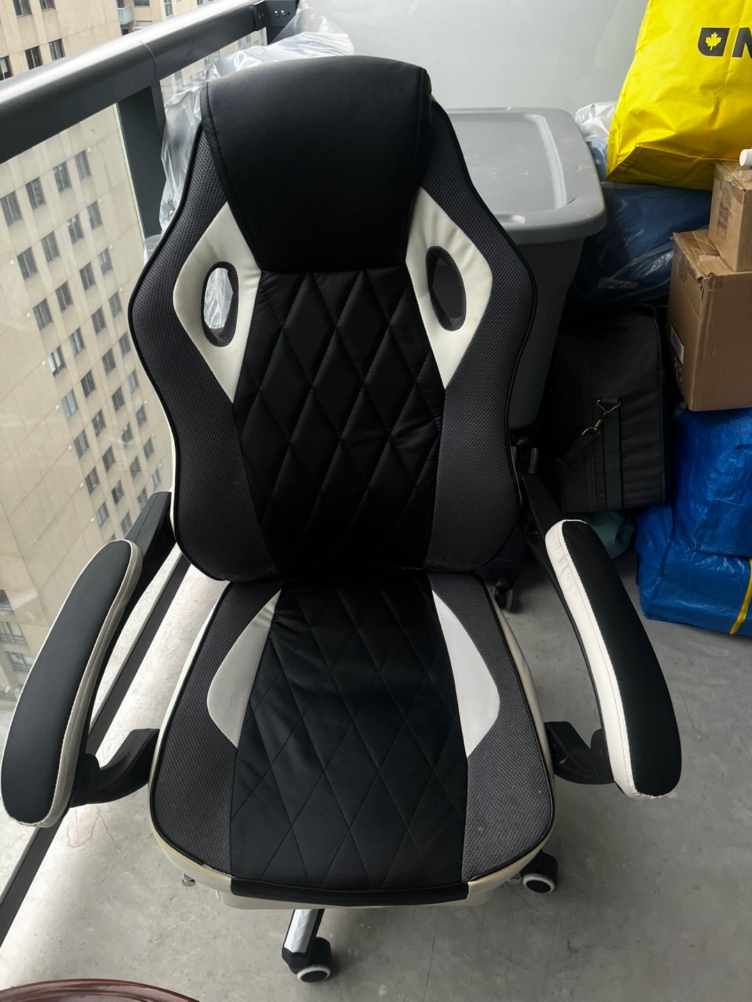 Black and white chair. Features a diamond pattern. Arm rests are adjustable. A great addition to your work or gaming space.