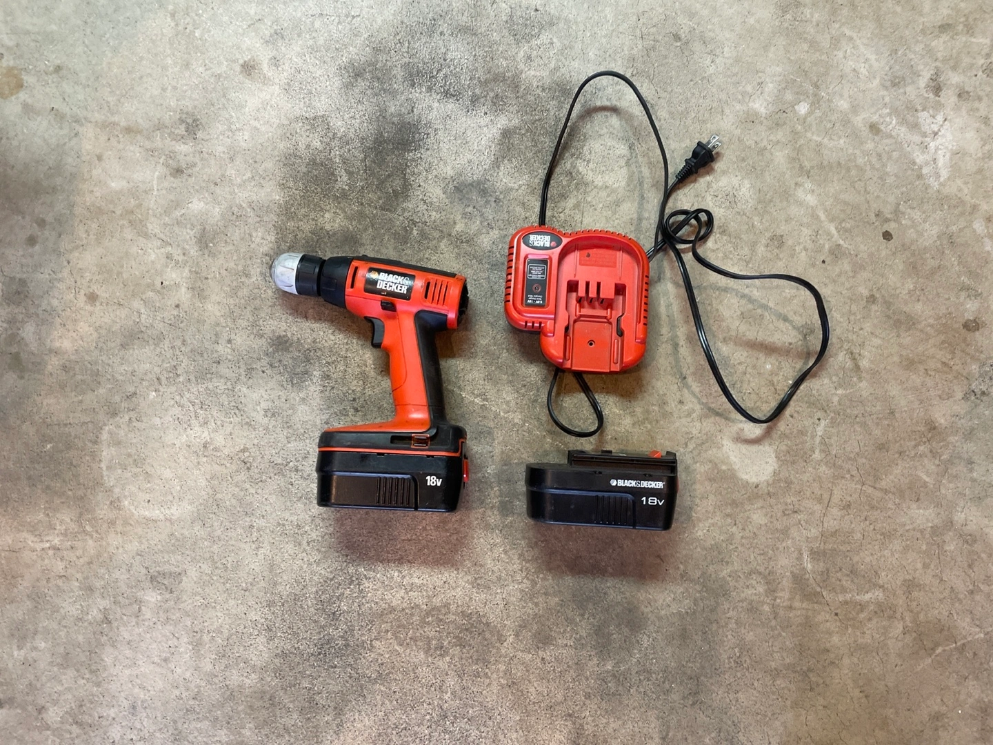 Drill, two batteries, and charger. Black and orange in colour. A great tool to have around the house for those little projects. However it is almost 10 years old so don’t expect it to be the best of the best of the best!