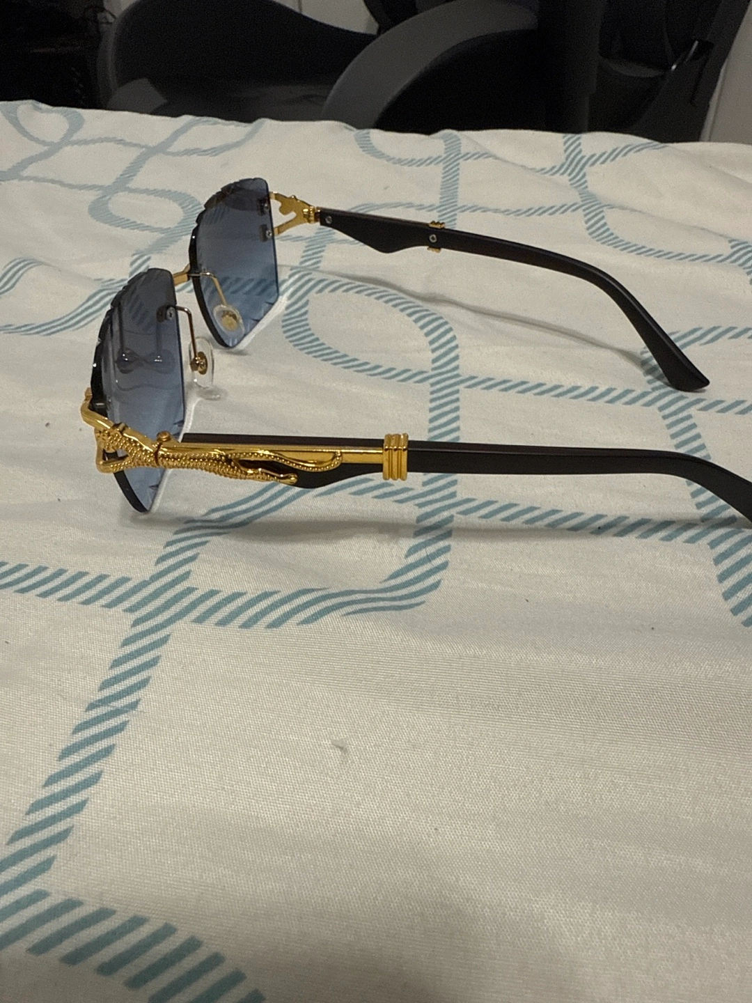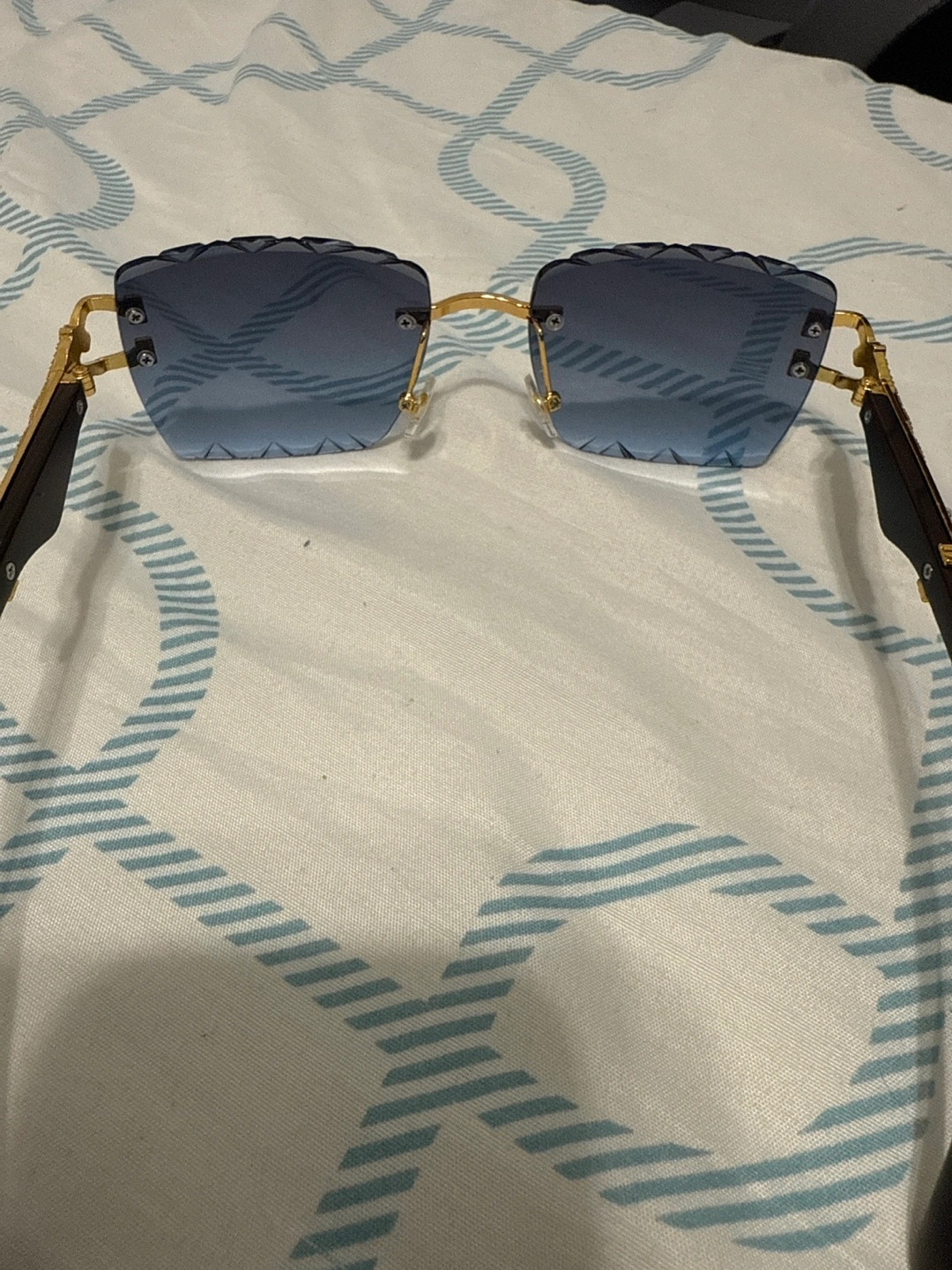 Rimless Blue tinted men’s glasses Stylish sunglasses. Features blue-tinted lenses. Frames are gold-toned and appear to be metal. The arms are dark in colour. Consider using these on a sunny day to see the world in a new light.
