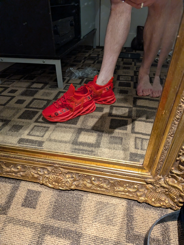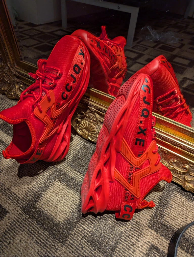 Stylish athletic sneakers, striking in a bold red colour. Detailed with intricate designs and laces. They would be perfect for your next jog or walk. brand new. to small for me