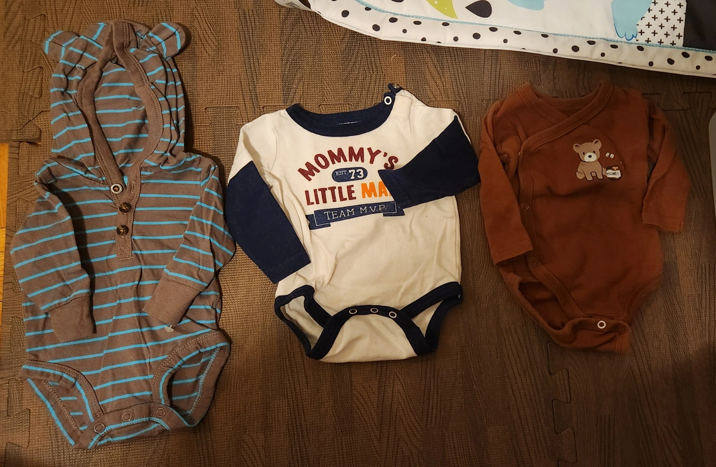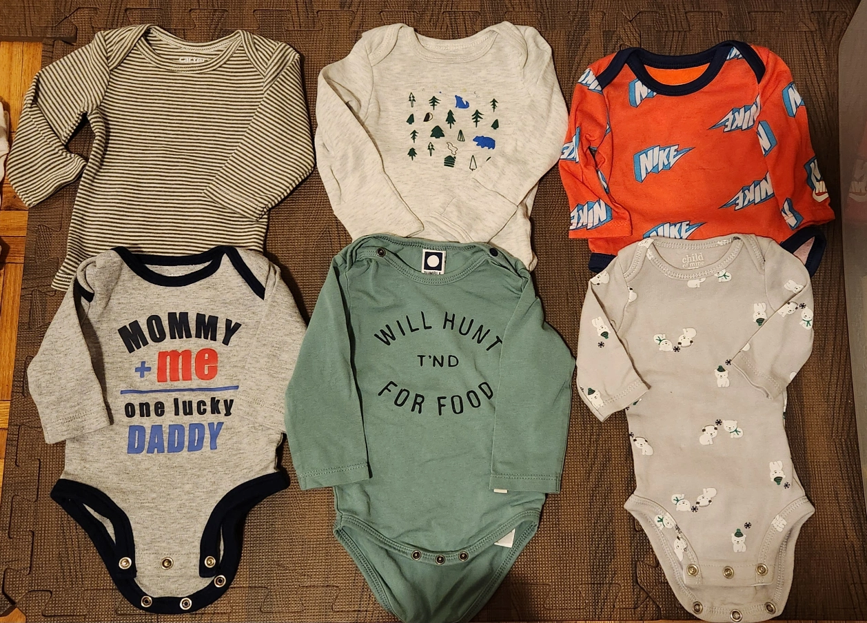 A collection of baby bodysuits in various colours and patterns. Perfect for keeping your little one cozy and content during playtime or naptime. size newborn cawthra and lakeshore