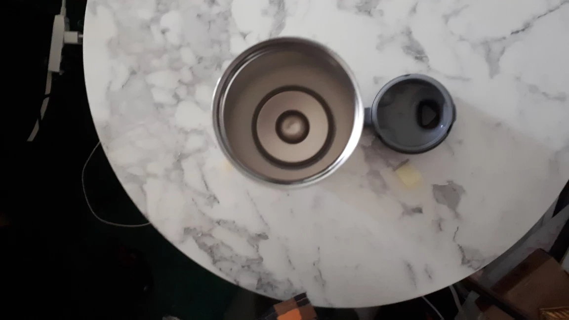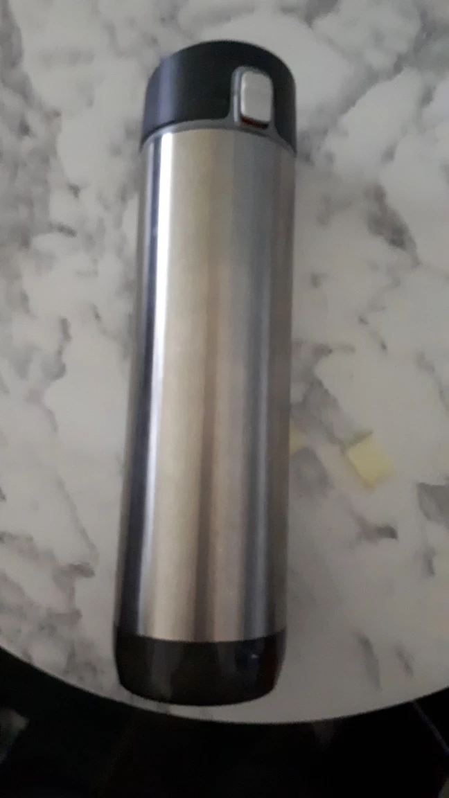 A sleek, stainless steel travel mug with a black lid. The mug is cylindrical, the lid has a push-button opening.