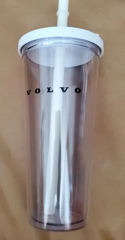 A clear plastic tumbler with a white lid and straw. Volvo logo is printed on the front. Could be perfect for a refreshing iced beverage on a warm day.