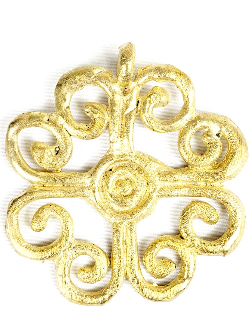 African Brass Adinkra Pendant Jewelry (Nyame Dua) . Features a unique swirl design. The piece has a loop at the top for easy wear. This pendant is a wonderful accessory to add to your wardrobe.