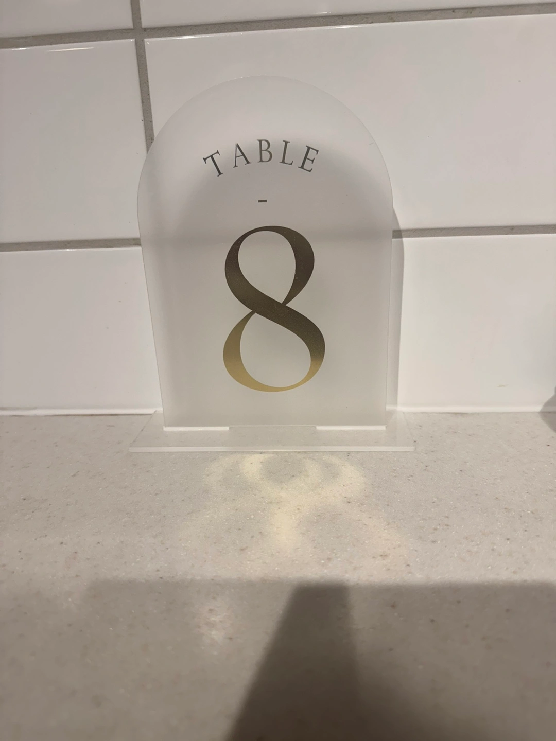 These table number holders feature a clean, modern design. Each has a sleek, frosted appearance with a gold number. The base appears clear, acrylic. These would be perfect for wedding receptions and special events, bringing an air of sophistication and order to your table settings.
