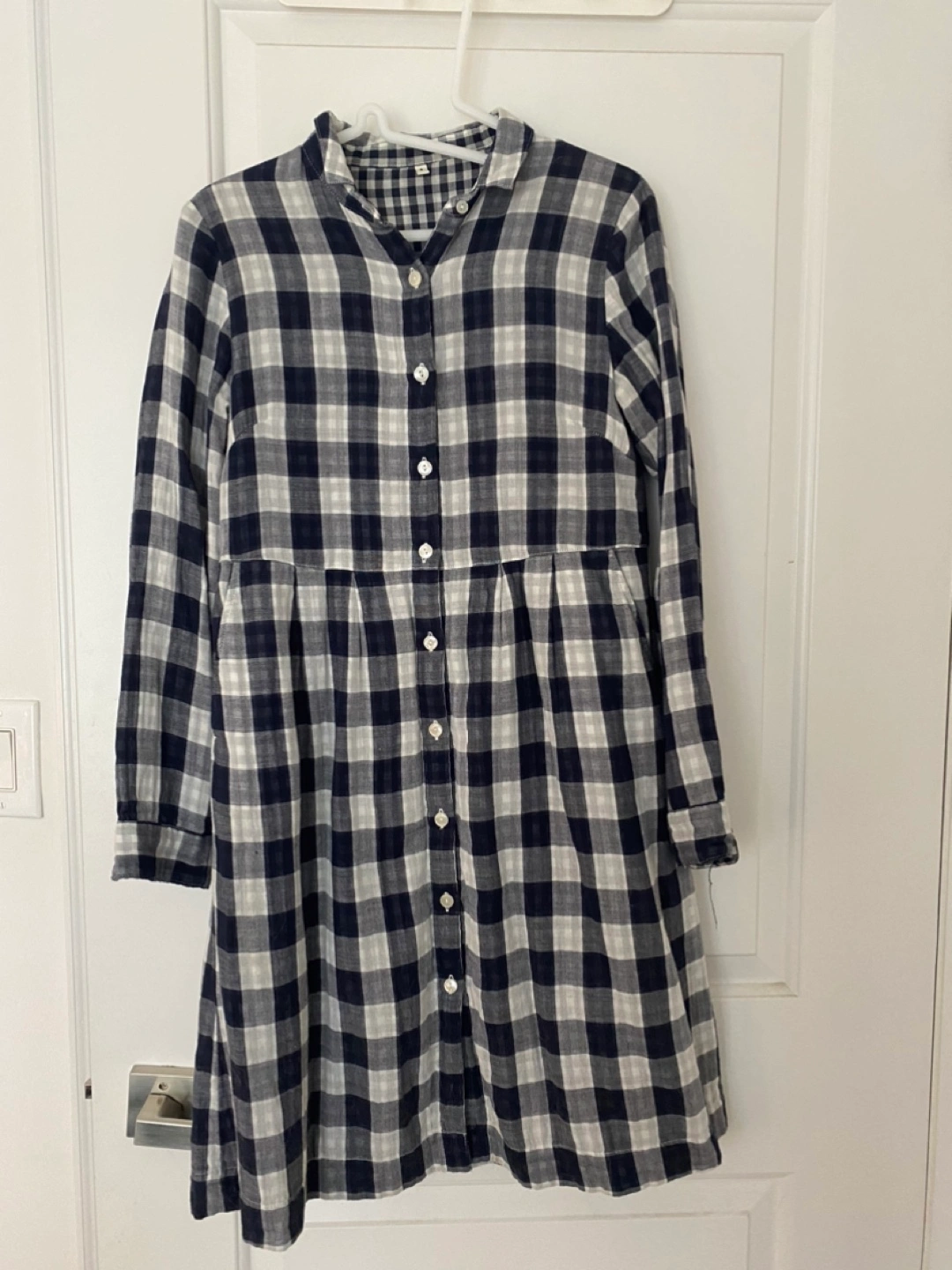 The plaid dress has long sleeves and a button-up front. The dress appears to be a babydoll style. Super comfy. I can meet at Adelaide east & sherbourne or king station most of the days!