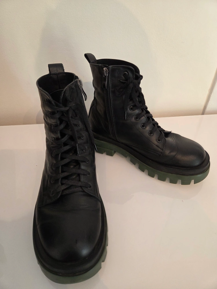 Black ankle genuine leather boots. Features a lace-up design. Green soles with a chunky look. Zippers on the sides. Super comfy.