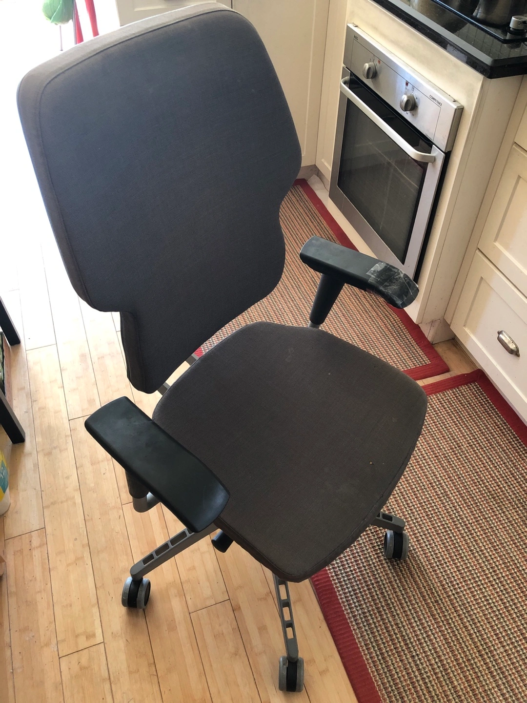 Ergonomic office chair with adjustable armrests, seat height, seat depth and backrest angle. The backrest is designed for optimal posture. Seat and backrest are well padded. Provides excellent support during long work sessions.