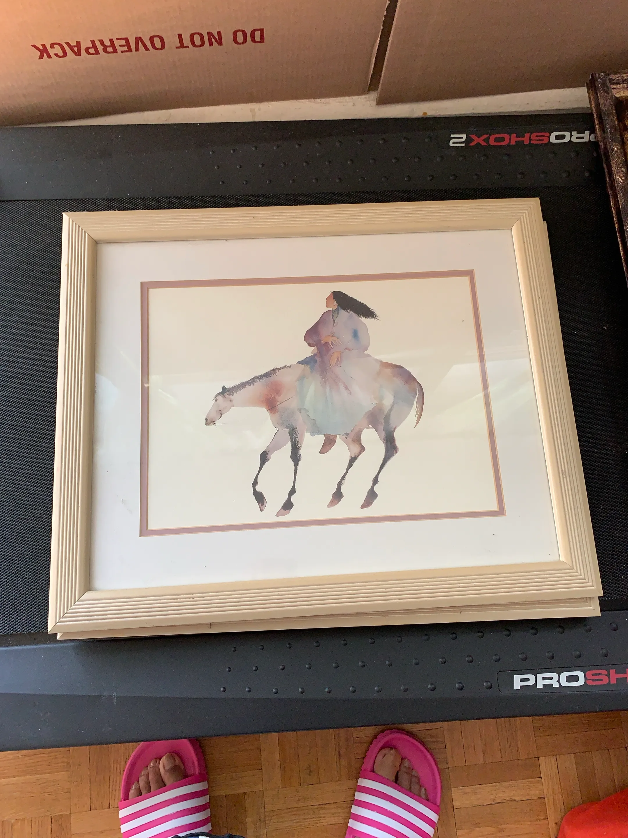 Painting depicts a person riding a horse. Framed with a cream-coloured wooden frame, with a white matting. A nice addition to your home decor.