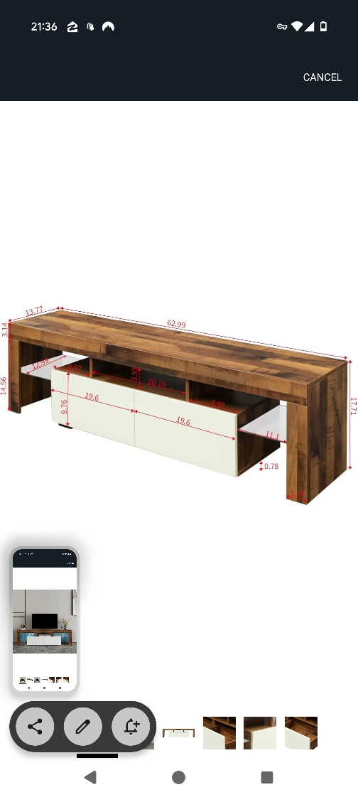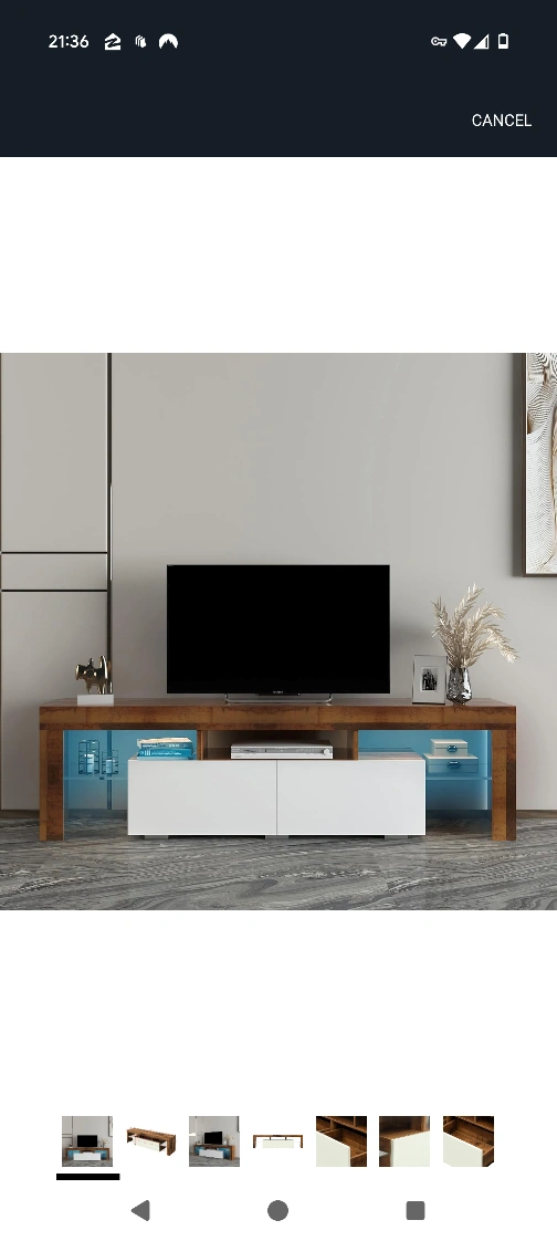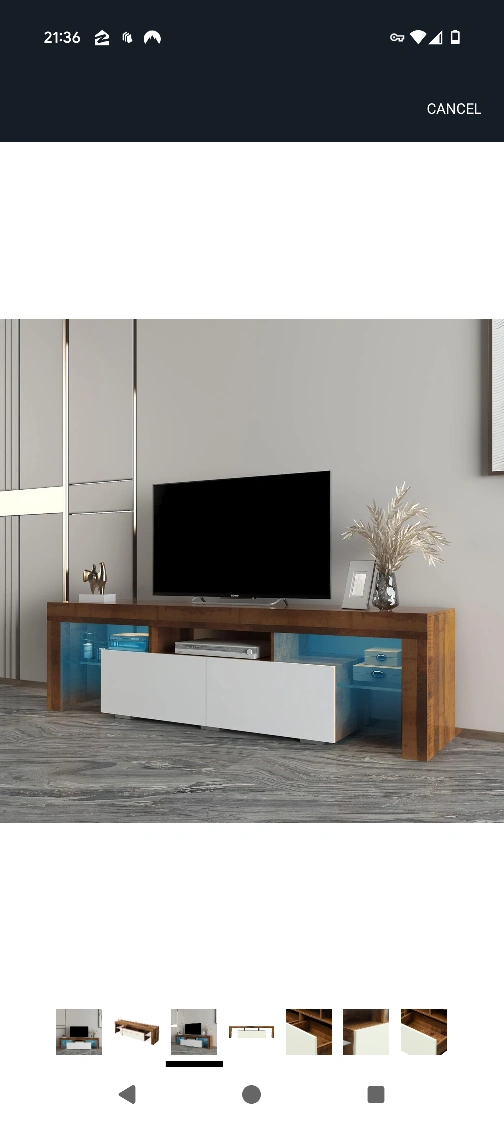 A TV stand with a two-tone design. It has two white cabinets for storage. There is a large open shelf. A great stand to enjoy a relaxing movie night.