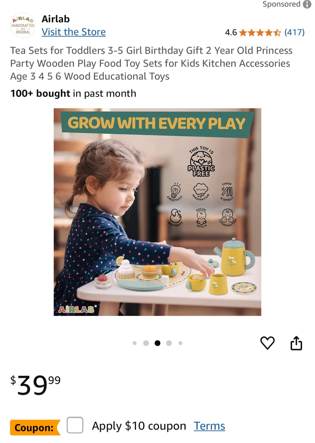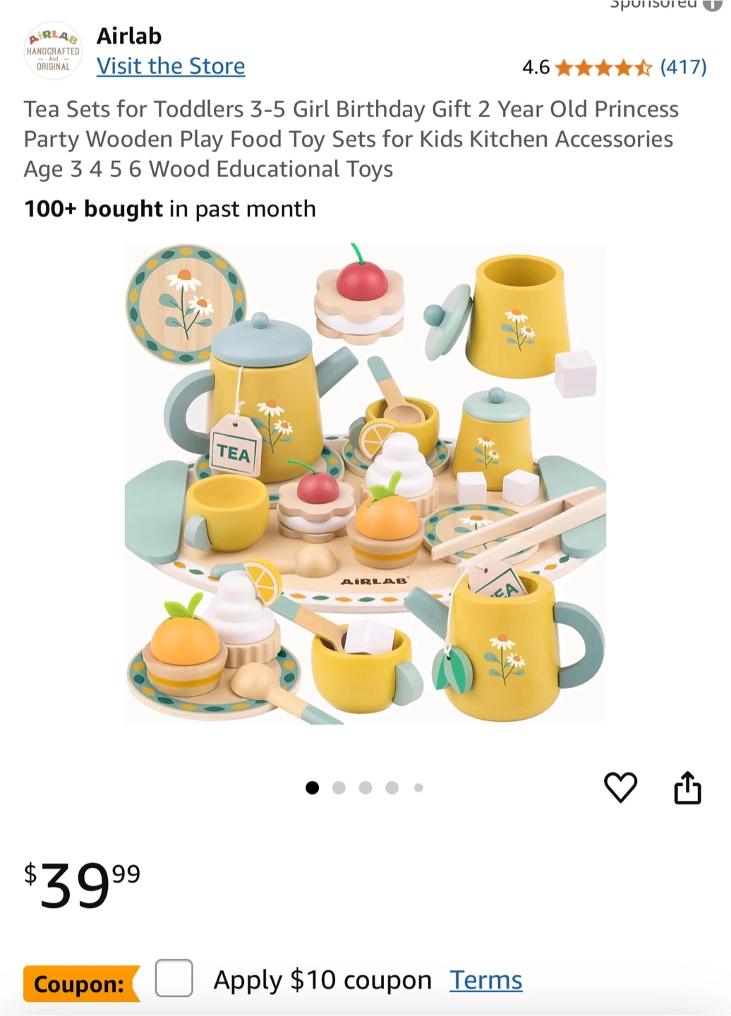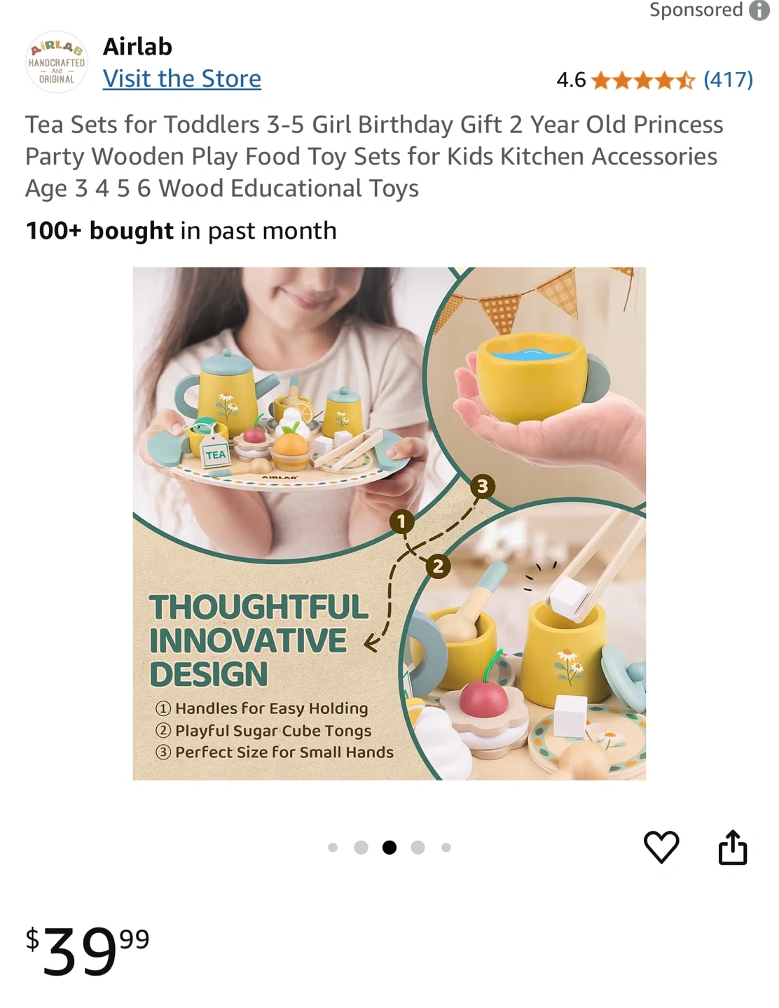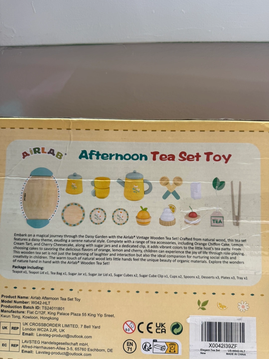 Brand new AirLab Afternoon Tea Set Toy for toddlers. The set is made of wood and includes a variety of tea party pieces. It's perfect for imaginative play and developing fine motor skills.