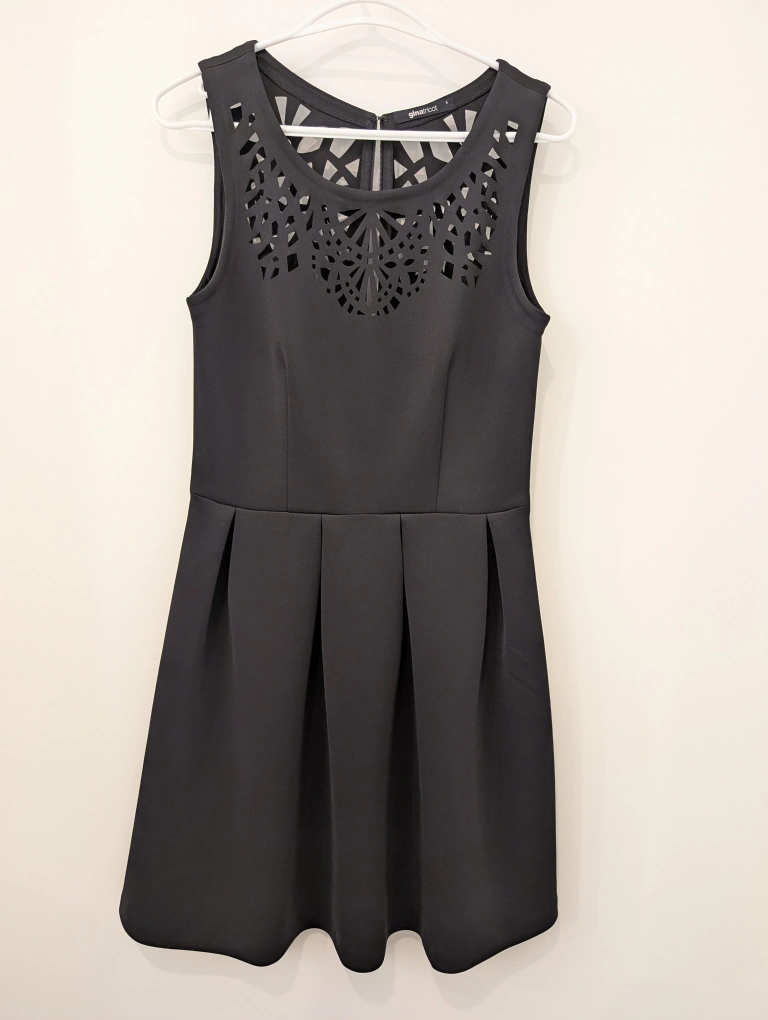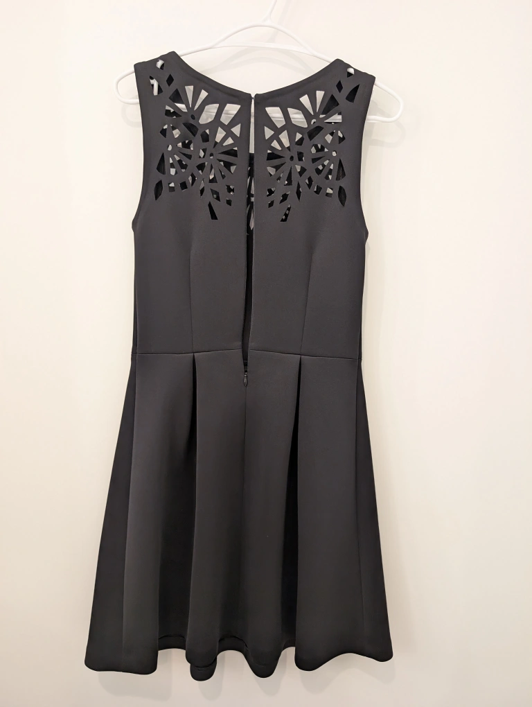 Black dress. Sleeveless design. Features a unique laser cut design on the back and shoulders. Pleated detail at the waistline. Zips up the back. A perfect dress for a nice night out.