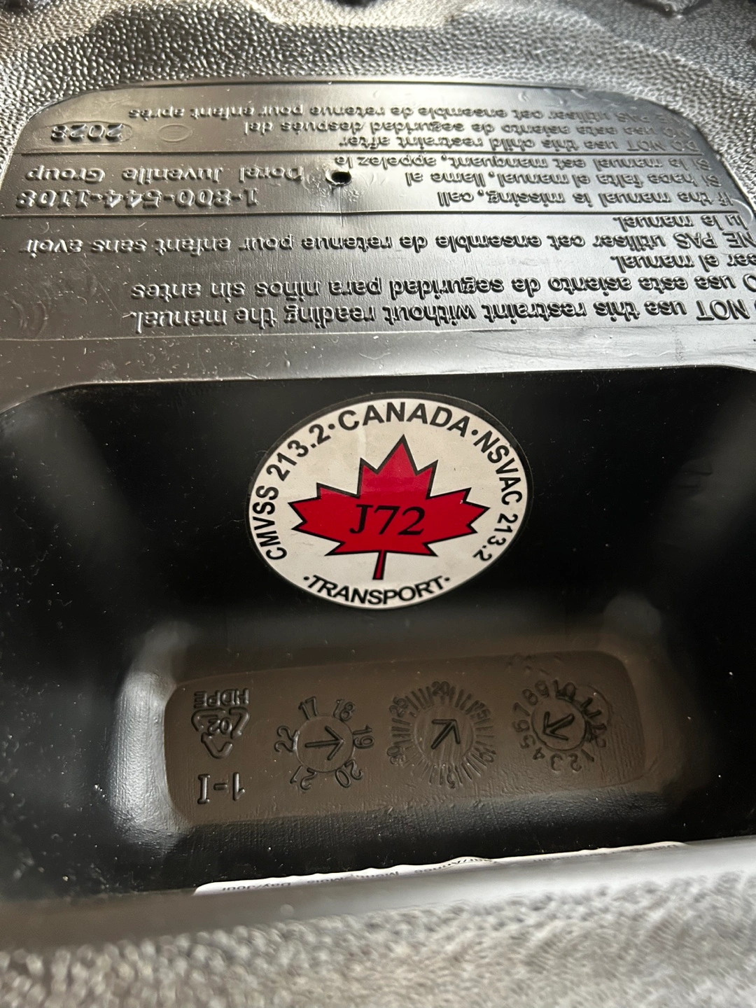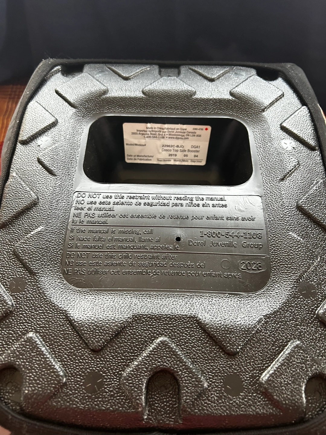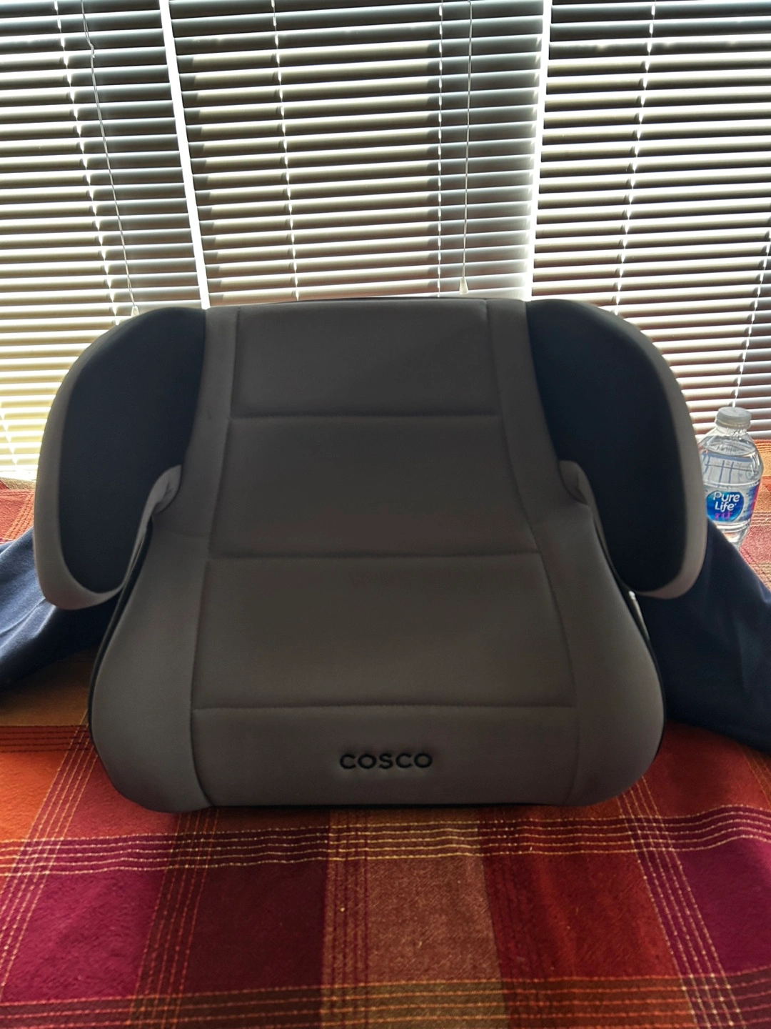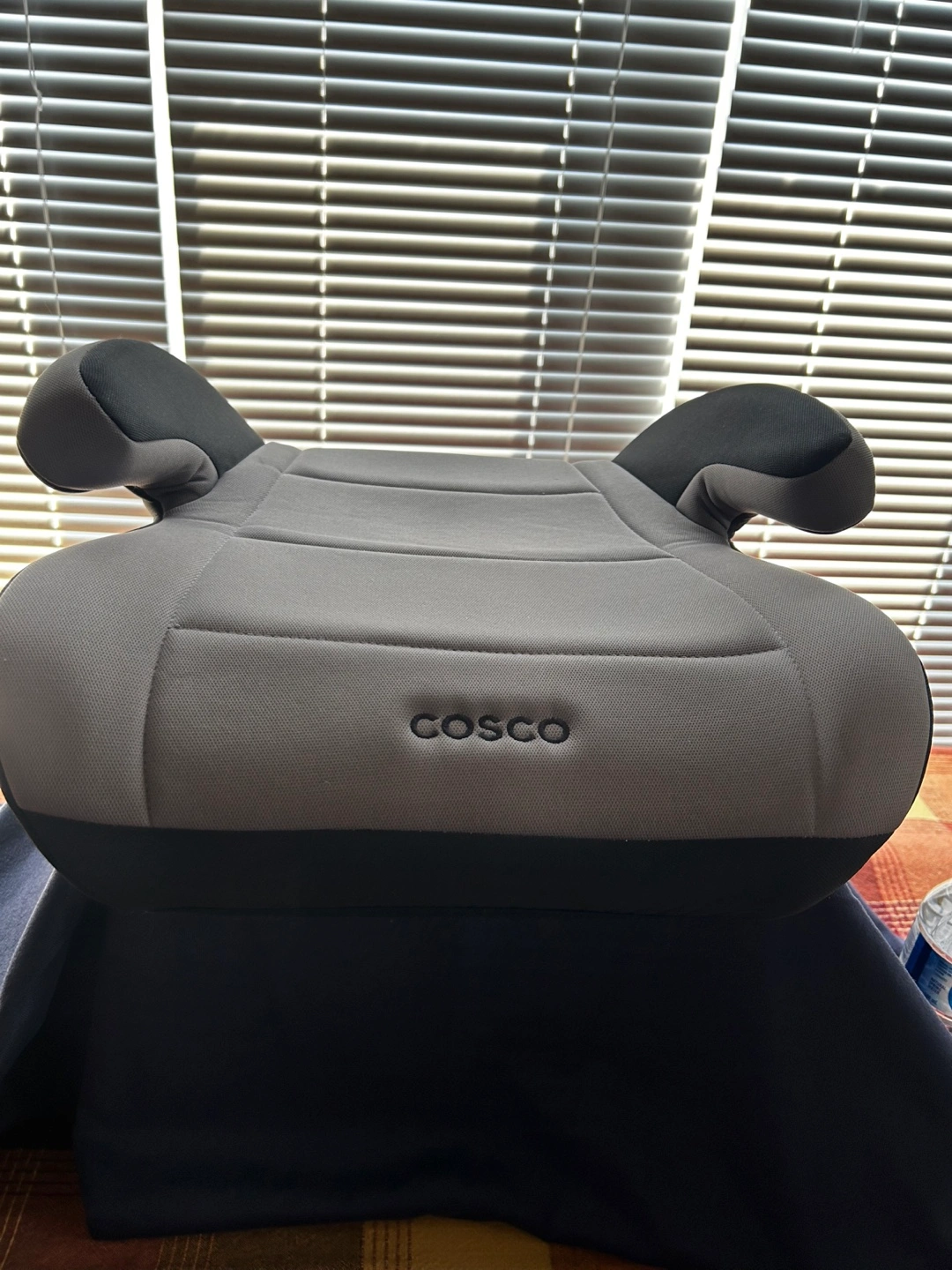 A booster seat, grey in colour. With built-in headrests and a simple design. A great way to keep your child safe while in the car.
