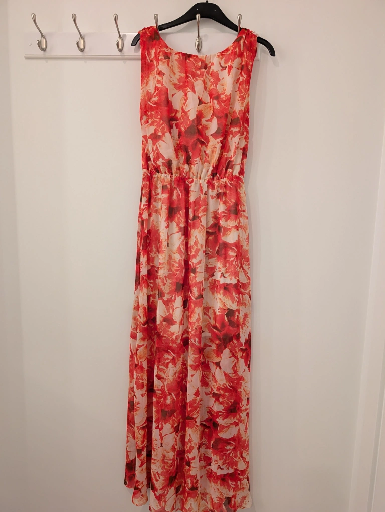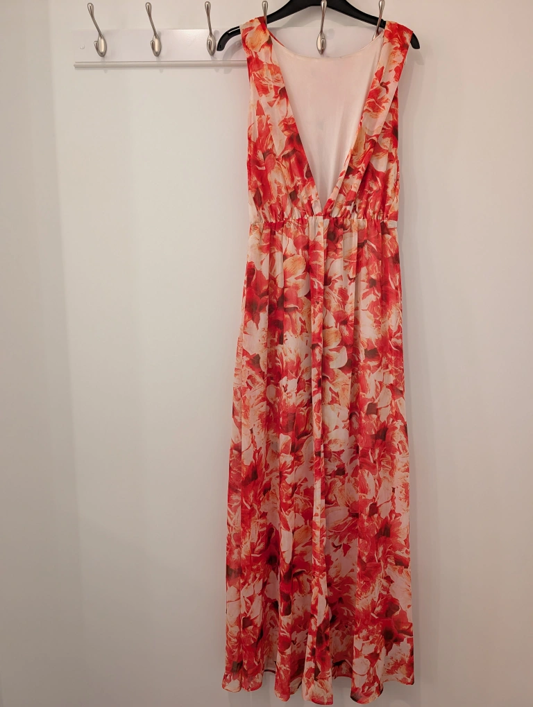 A stunning red floral, breezy, maxi dress. With open back, thigh high slits on both sides, see-through legs. Elastic waist for a flattering fit. Pictures don't do this dress justice!!!
