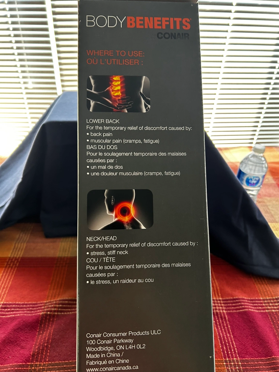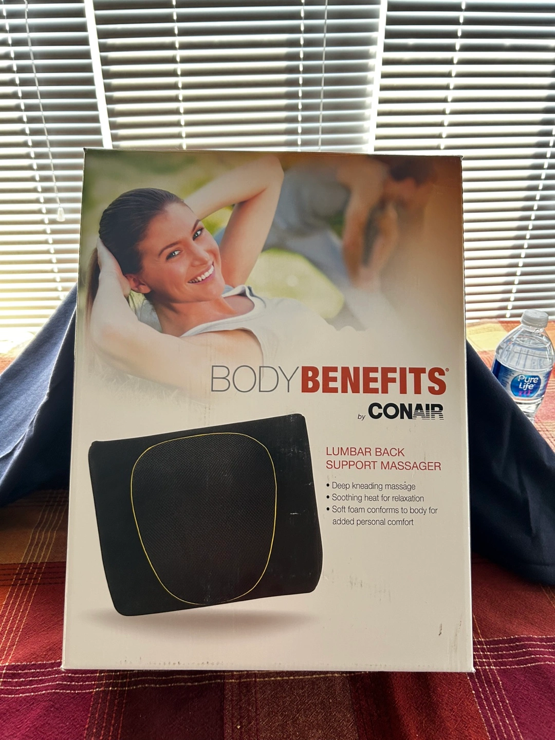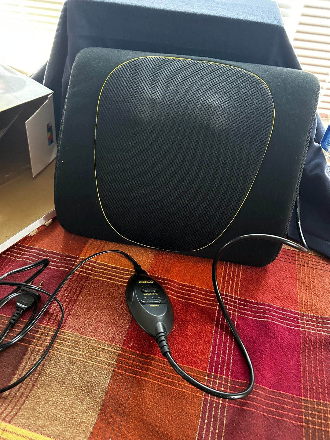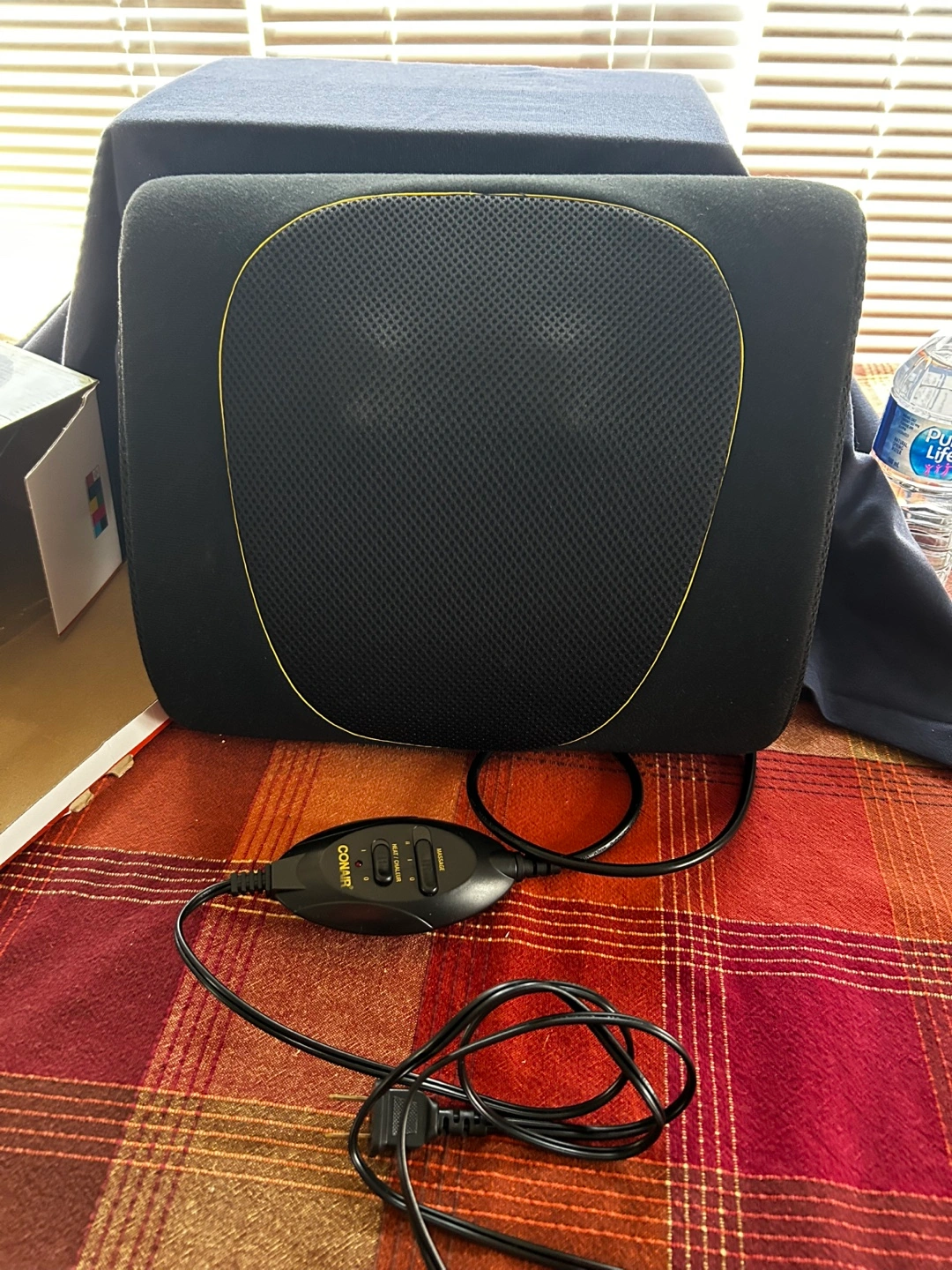 A lumbar back support massager. Deep kneading massage and soothing heat for relaxation. Made with soft foam for added personal comfort. You can use it for your back pain, or your neck/head.