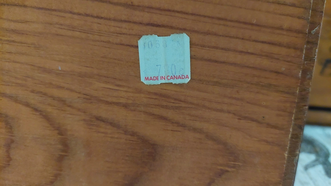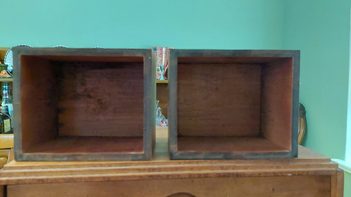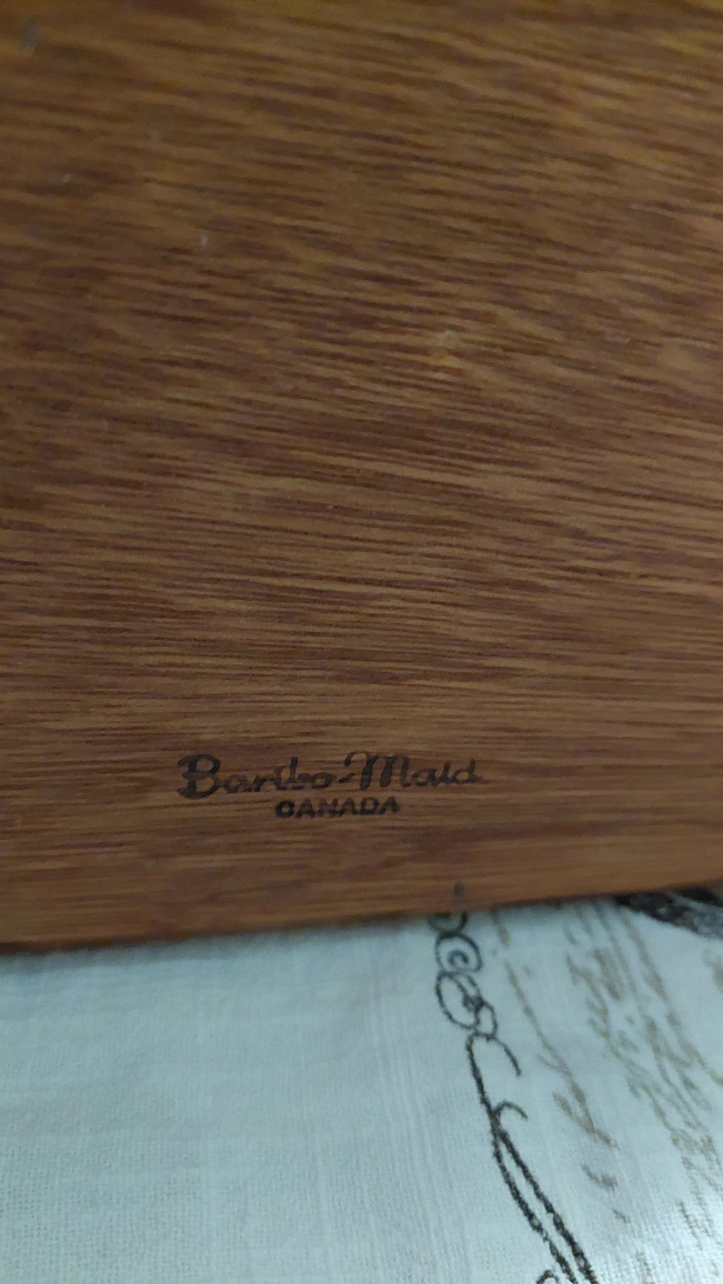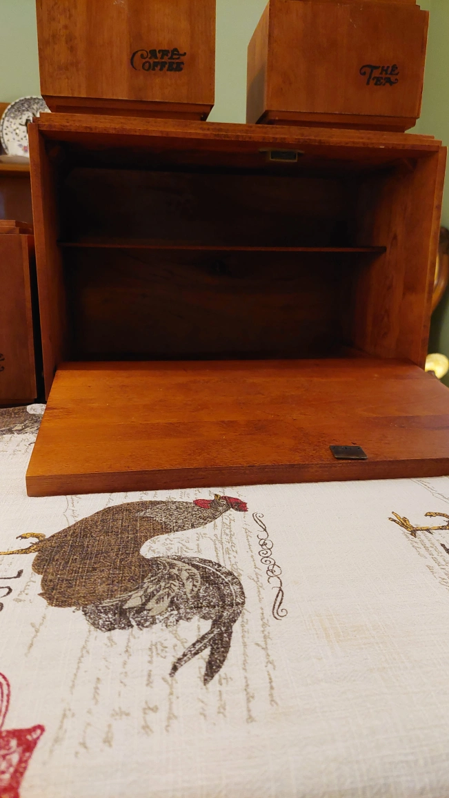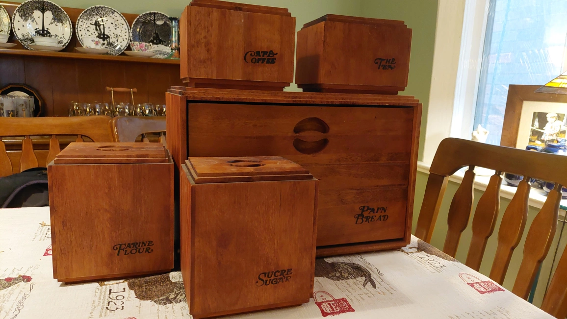 A vintage set, constructed of wood. Includes a bread box, several canisters, and two open boxes. The wooden box designs are simple with inscriptions on the front. This set would make a great addition to any kitchen.