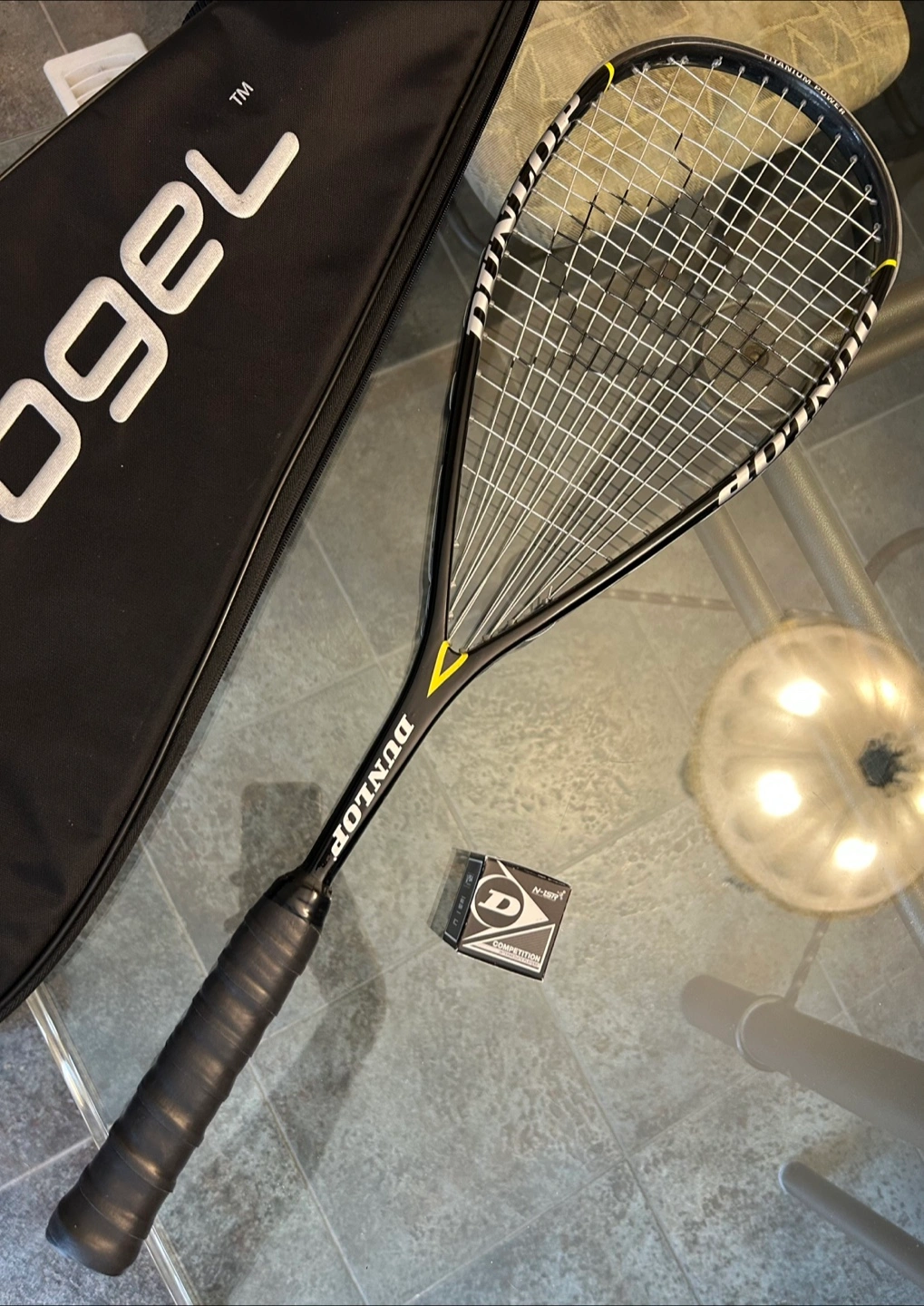 $90 for 1 racket/1 padded carrying bag/1 Dunlop yellow dot squash ball.