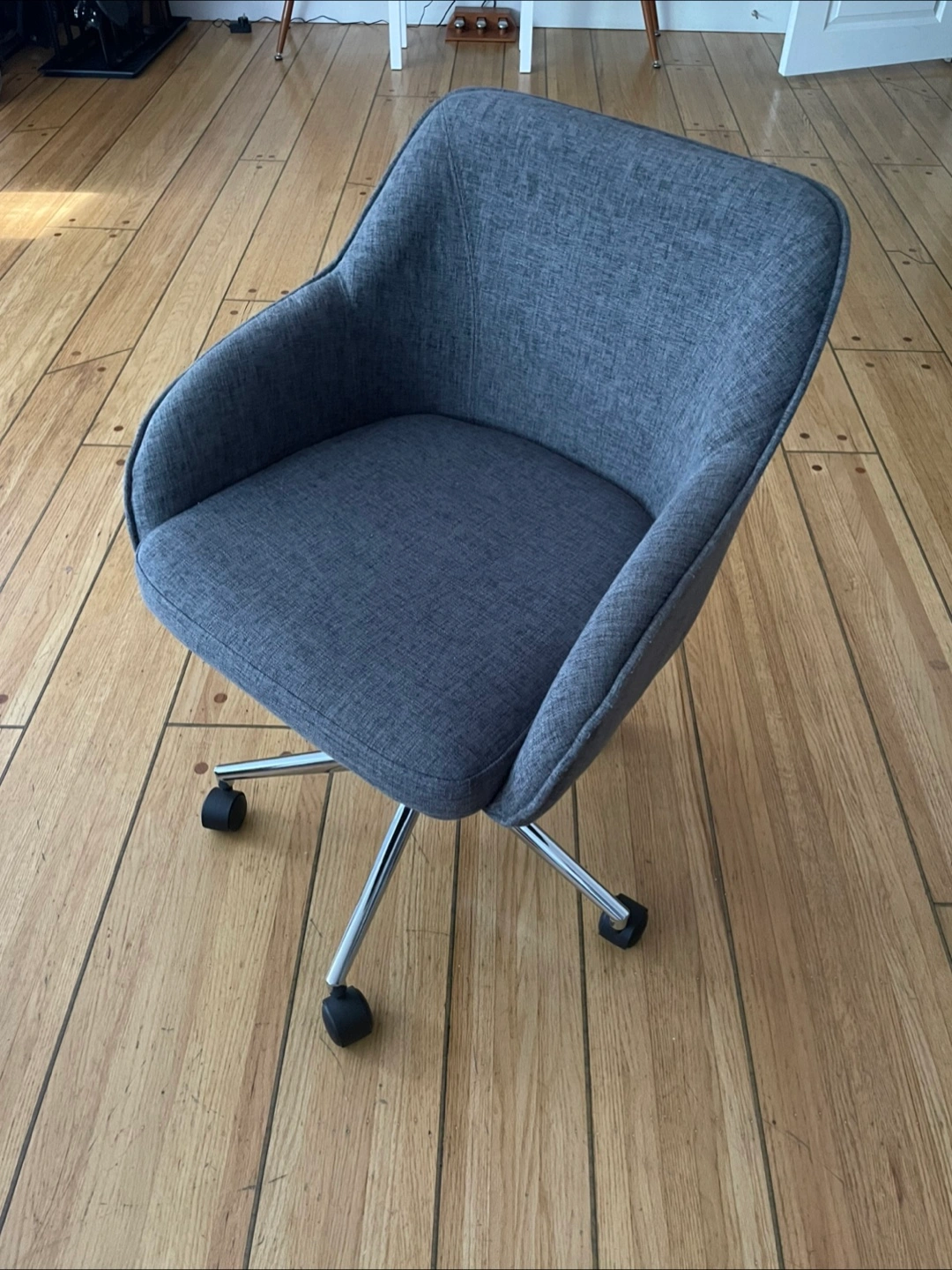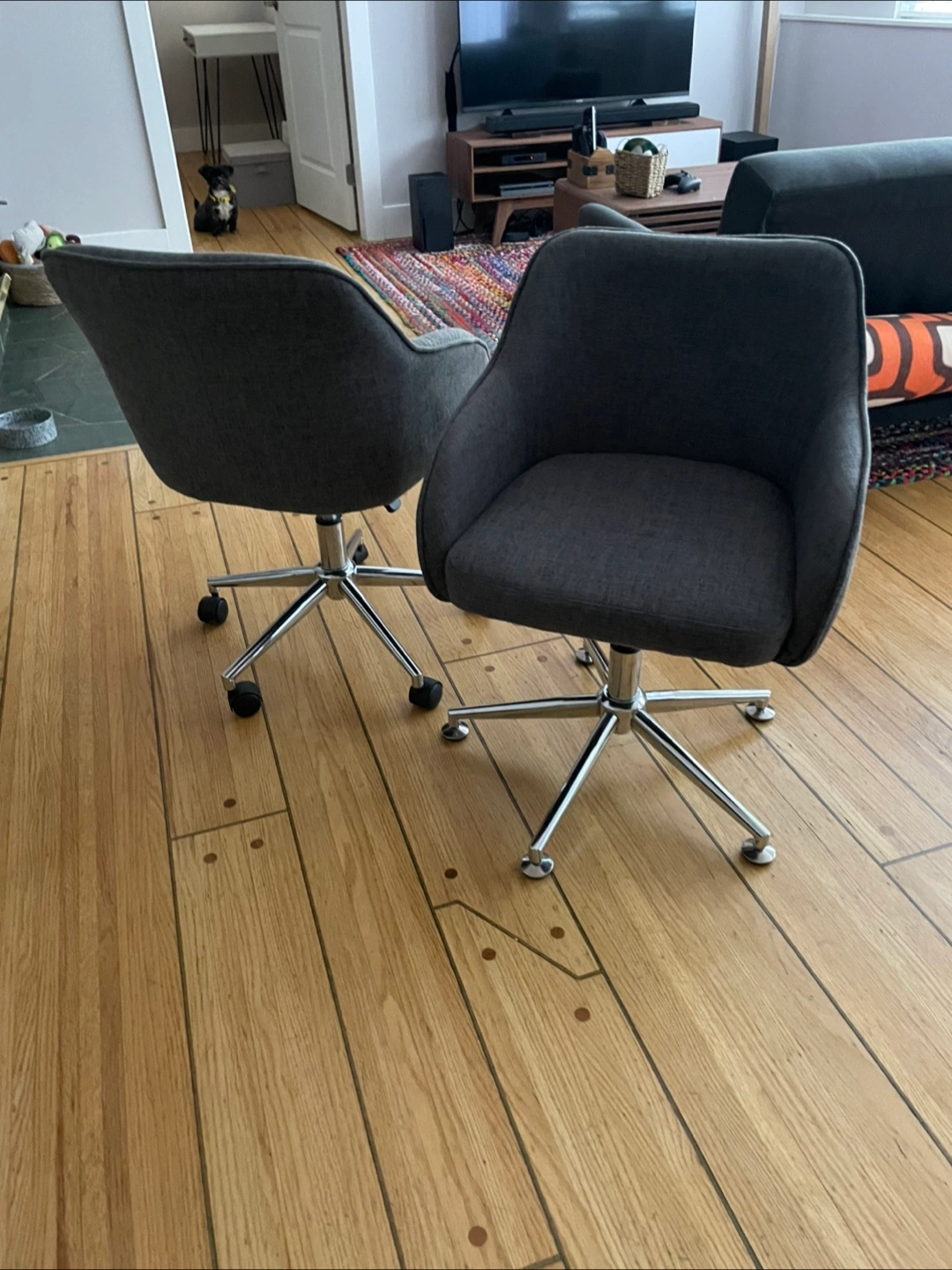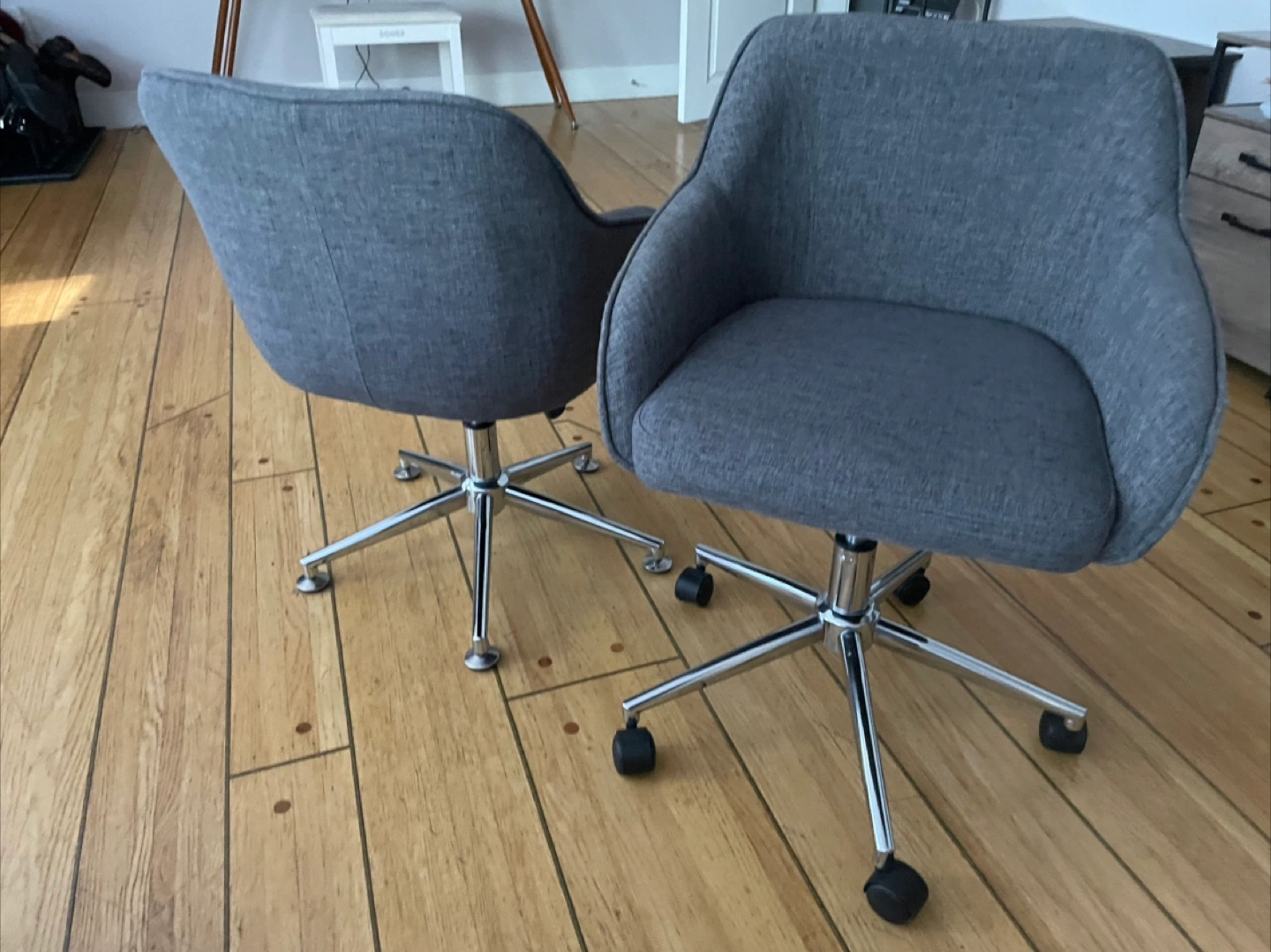 A pair of stylish mid-century modern grey office chairs with a silver base and black wheels. They are upholstered in a dark grey fabric. In pristine condition! You’re welcome to buy 1 or both. I’m moving so I can’t take these lovely chairs with me.