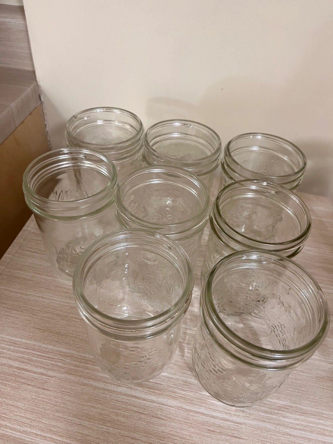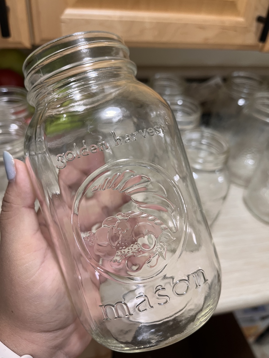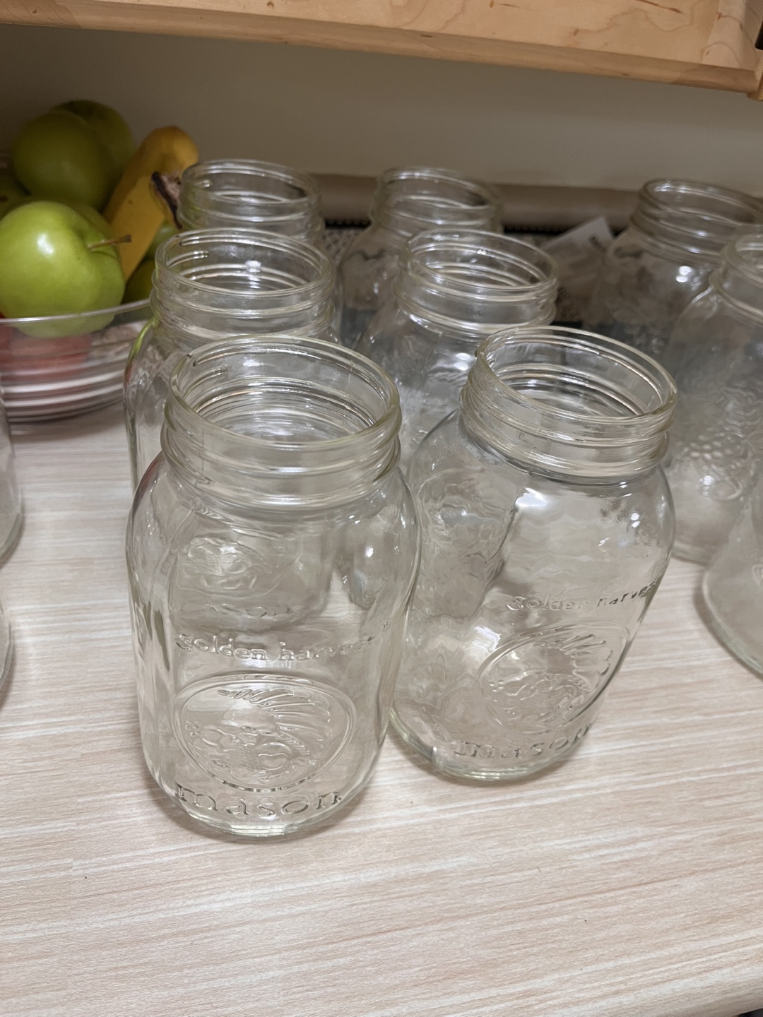 Mason jars are wonderful for canning and preserving. There are several clear glass jars of various sizes. Some jars have the "BERNARDIN MASON" wording. Others show the "golden harvest mason" logo. The jars are ready to be used to store food or whatever you wish.