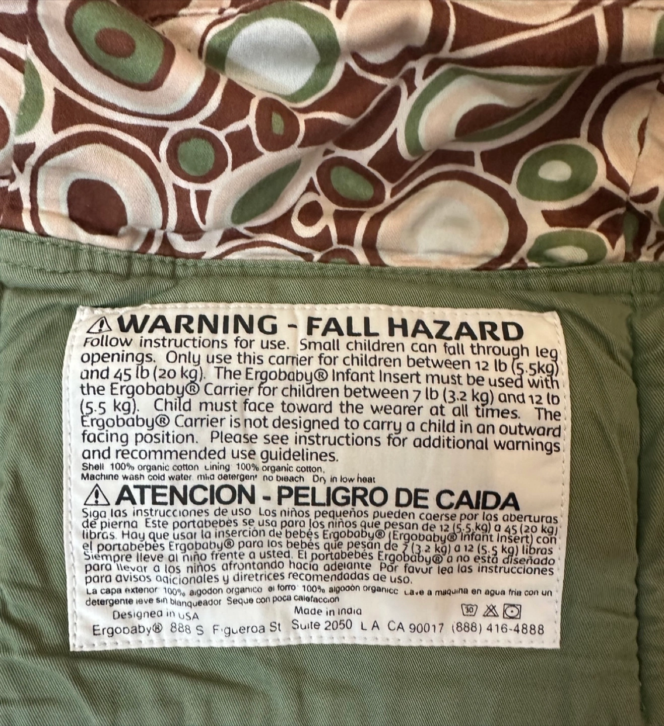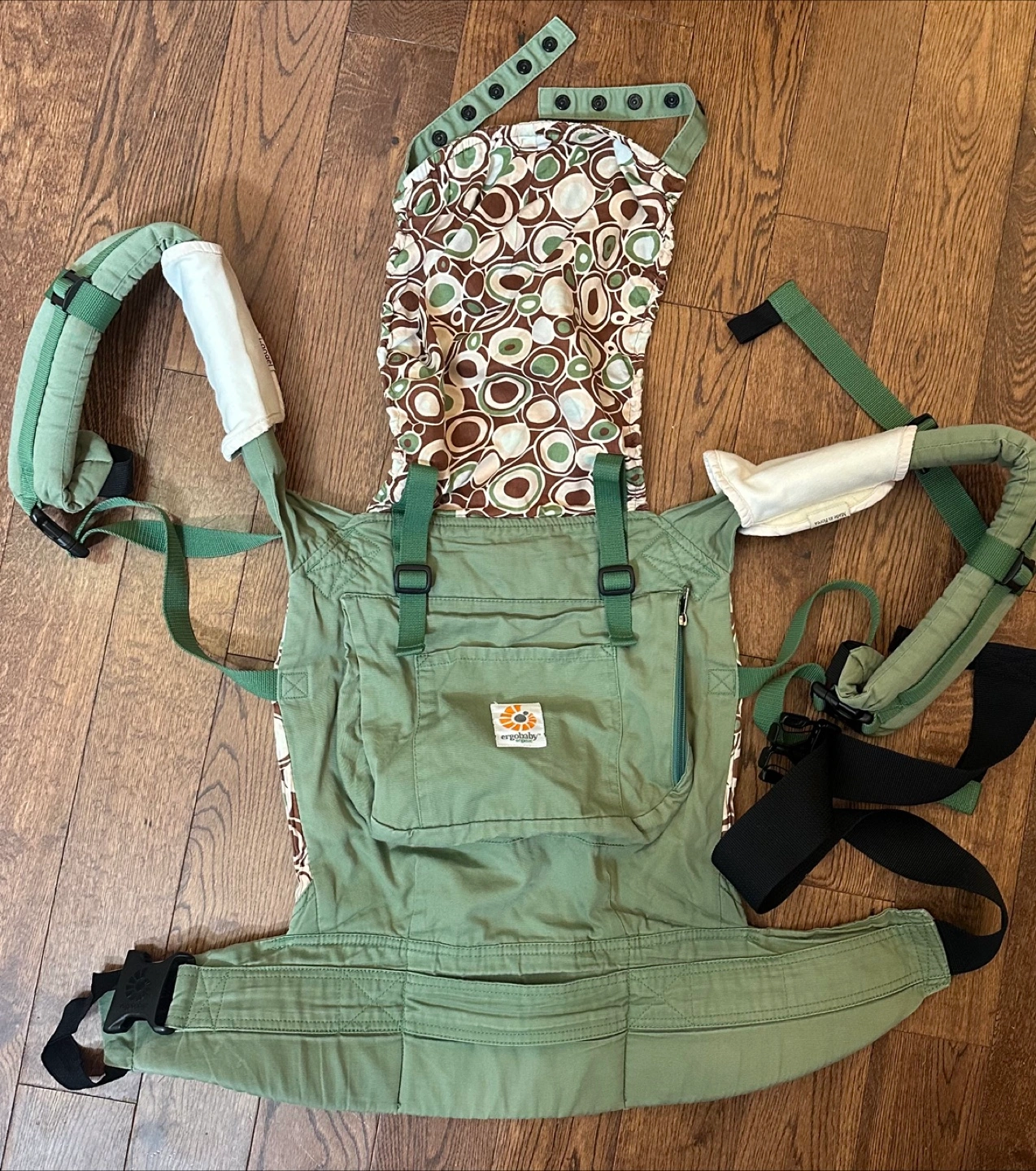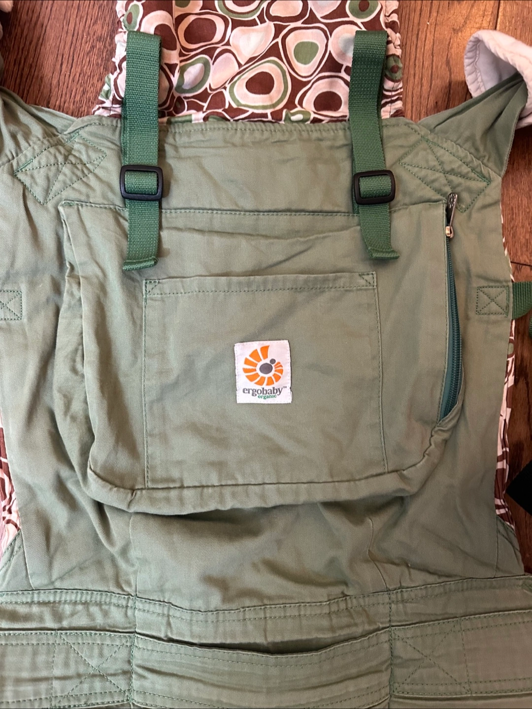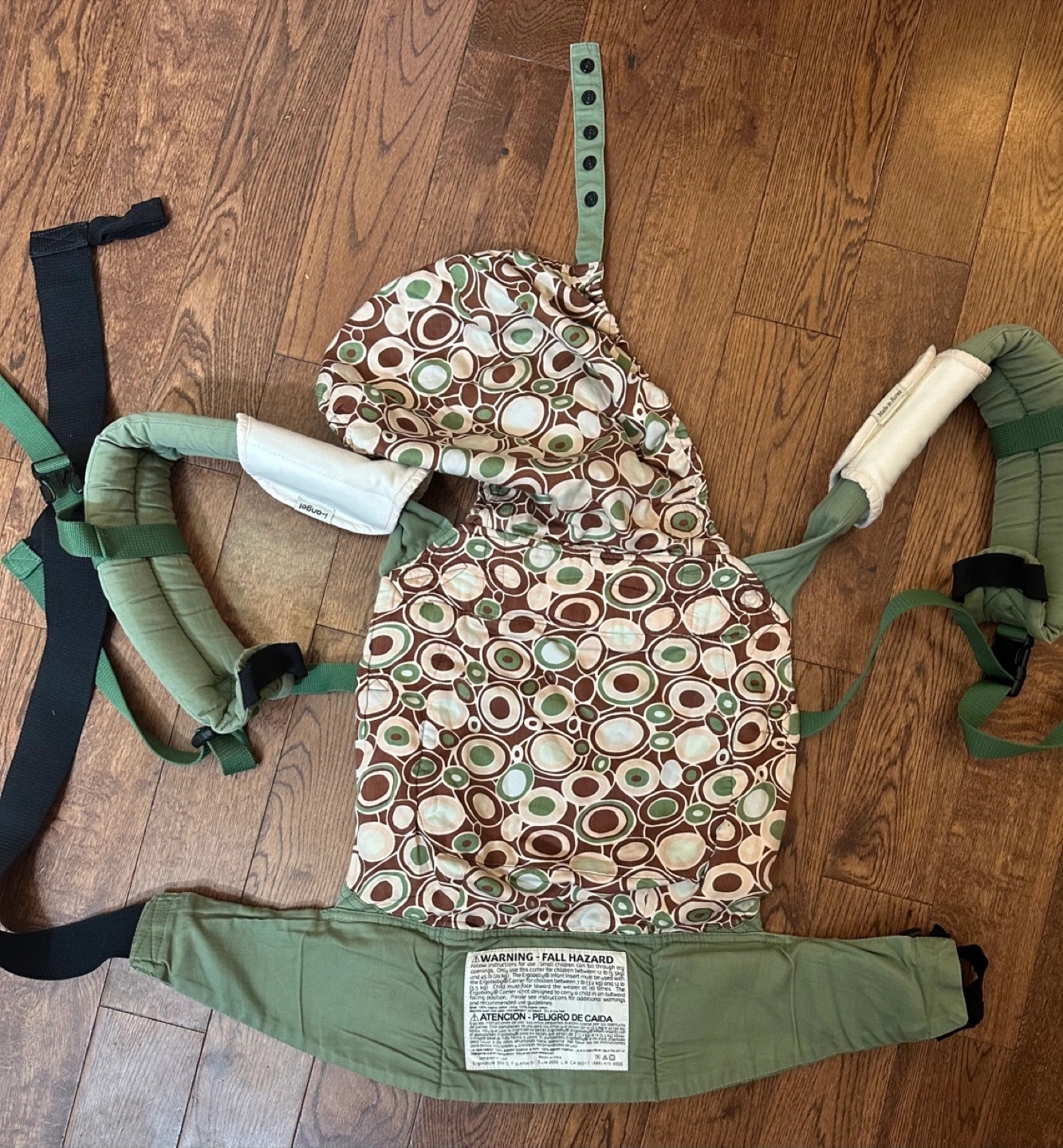 A baby carrier, perfect for keeping your little one close. It includes a removable hood with a unique pattern and padded shoulder straps. Featuring adjustable straps and a front pocket with a zipper. Made of organic material.