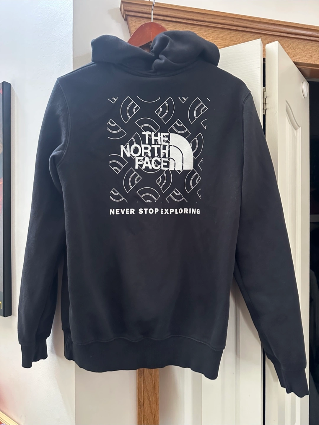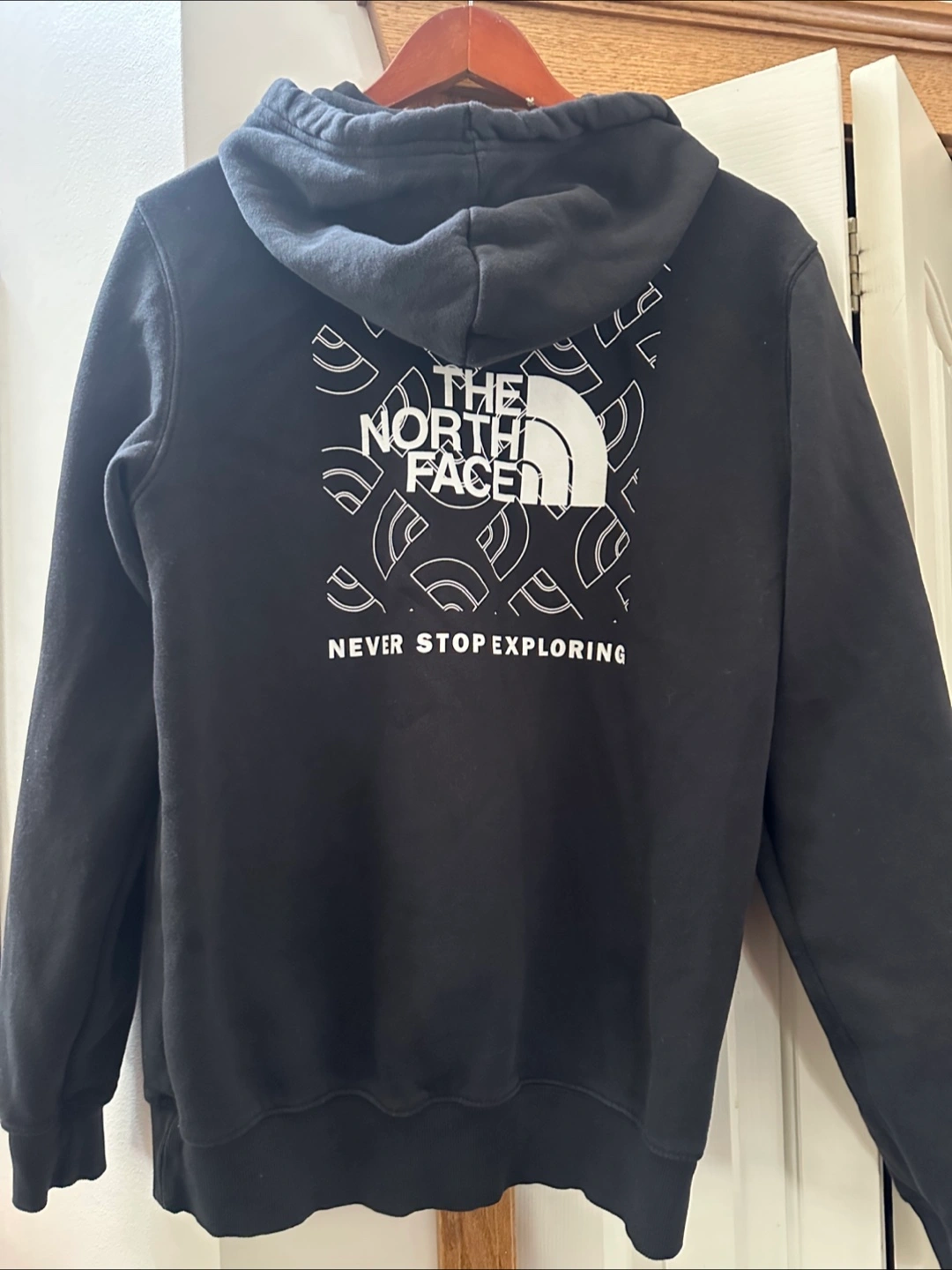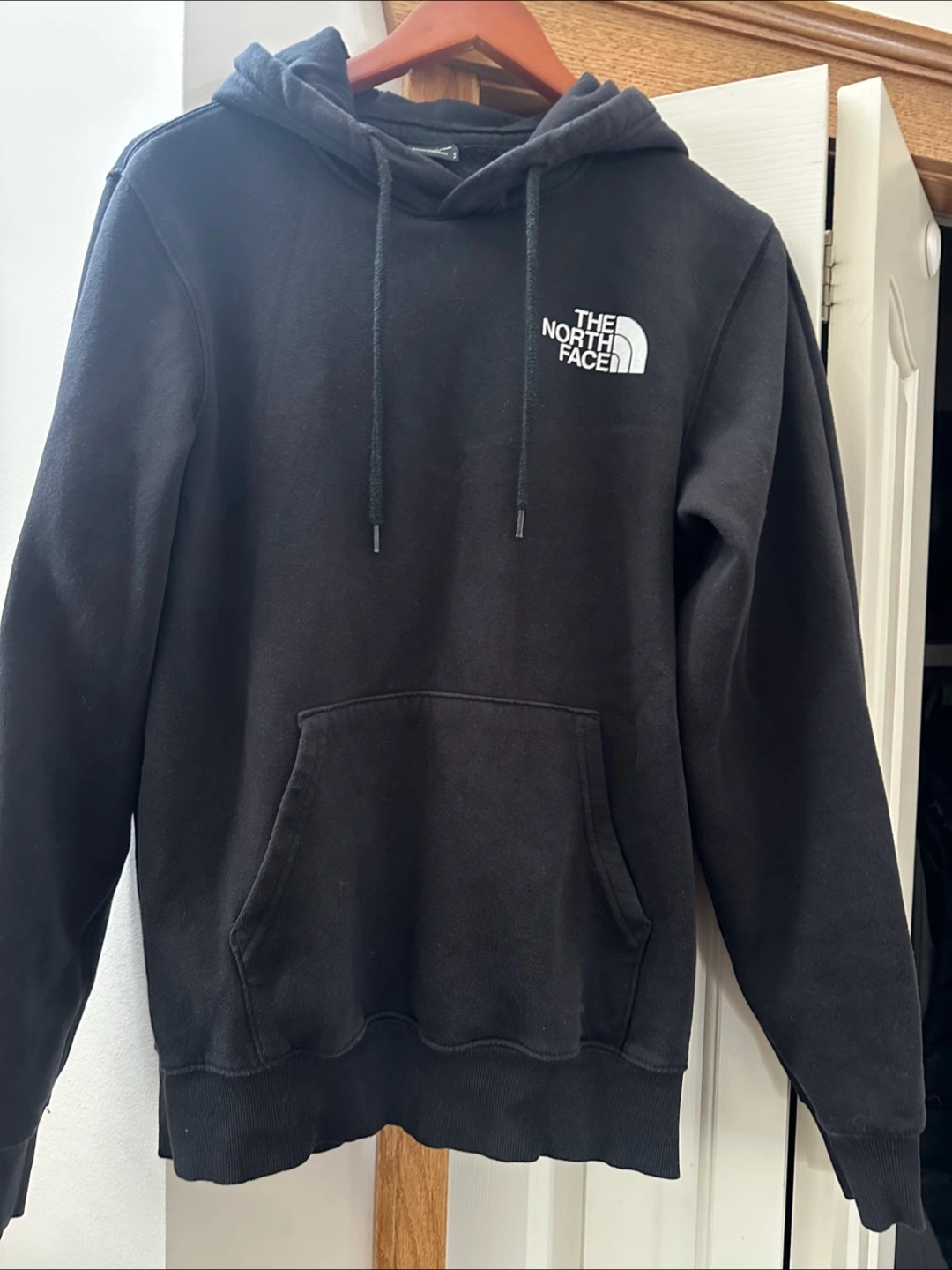 A nice black hoodie. Has a front pouch and a hood. The North Face logo on the front and back. It's a great item to wear when you want to relax and unwind after a long day.