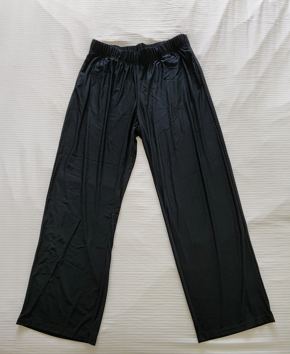 Bottoms: Classic black wide-leg pants with a relaxed, flowy fit. Super comfy and versatile!