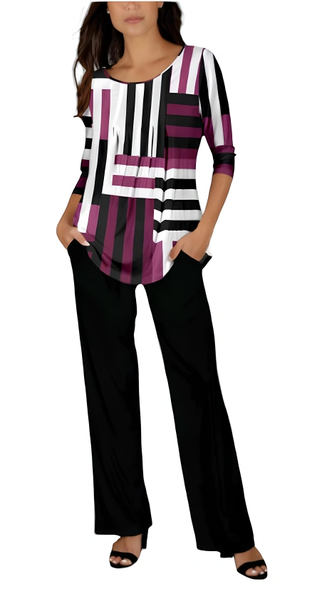 Top: Eye-catching geometric print in black, white, and rich plum – perfect for both casual outings and dressing up. Flattering round neckline with 3/4 sleeves.