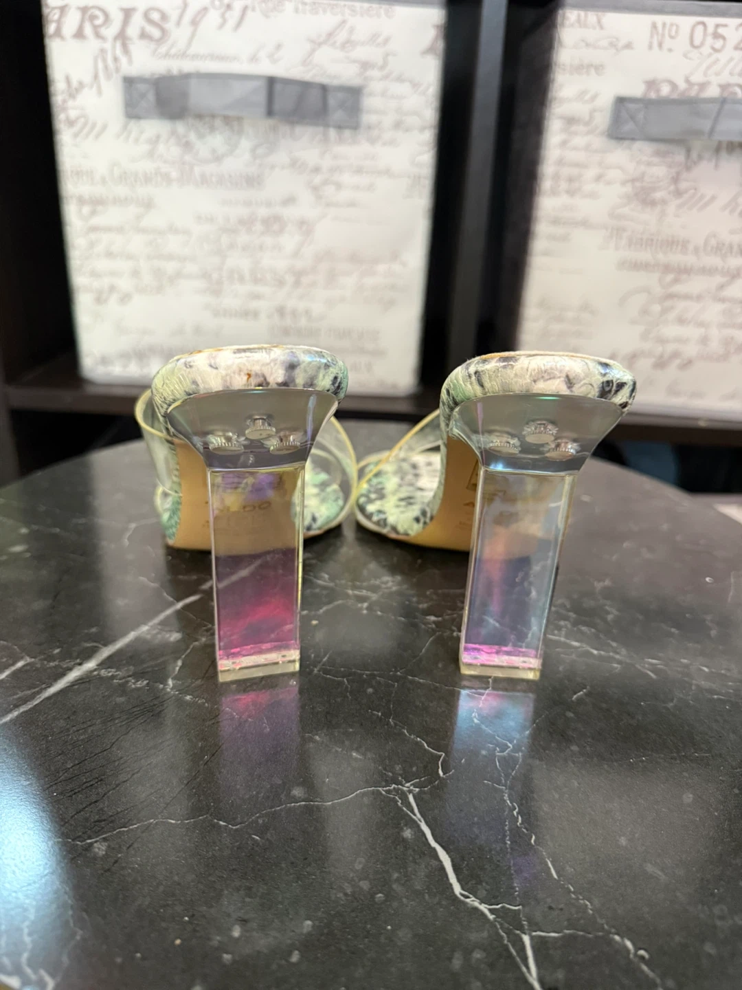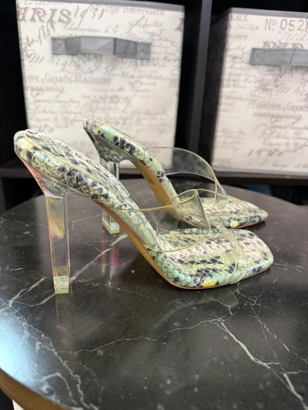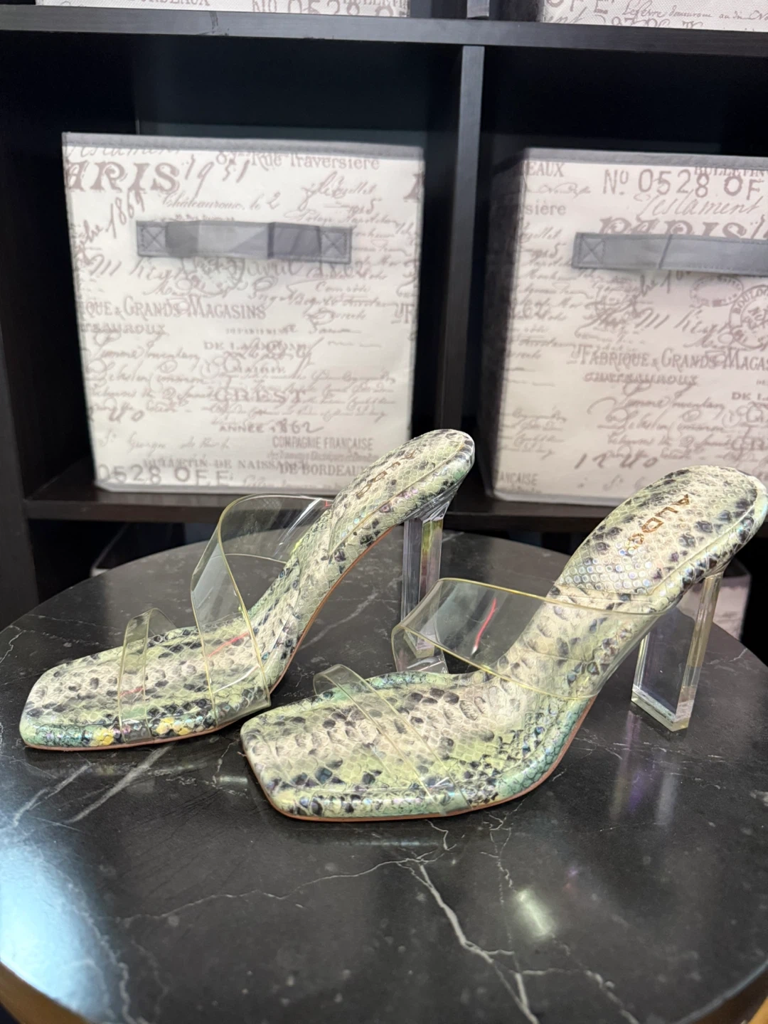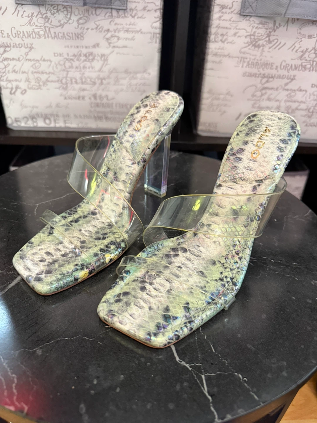 These ALDO heels feature a clear strap design with a striking snake print. The block heel offers a stylish and comfortable lift. Perfect for adding a touch of flair to any outfit!