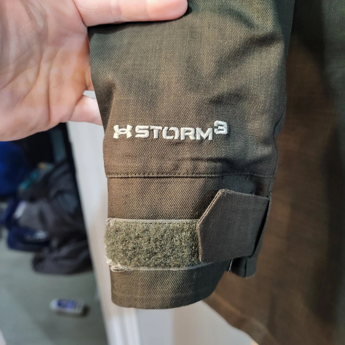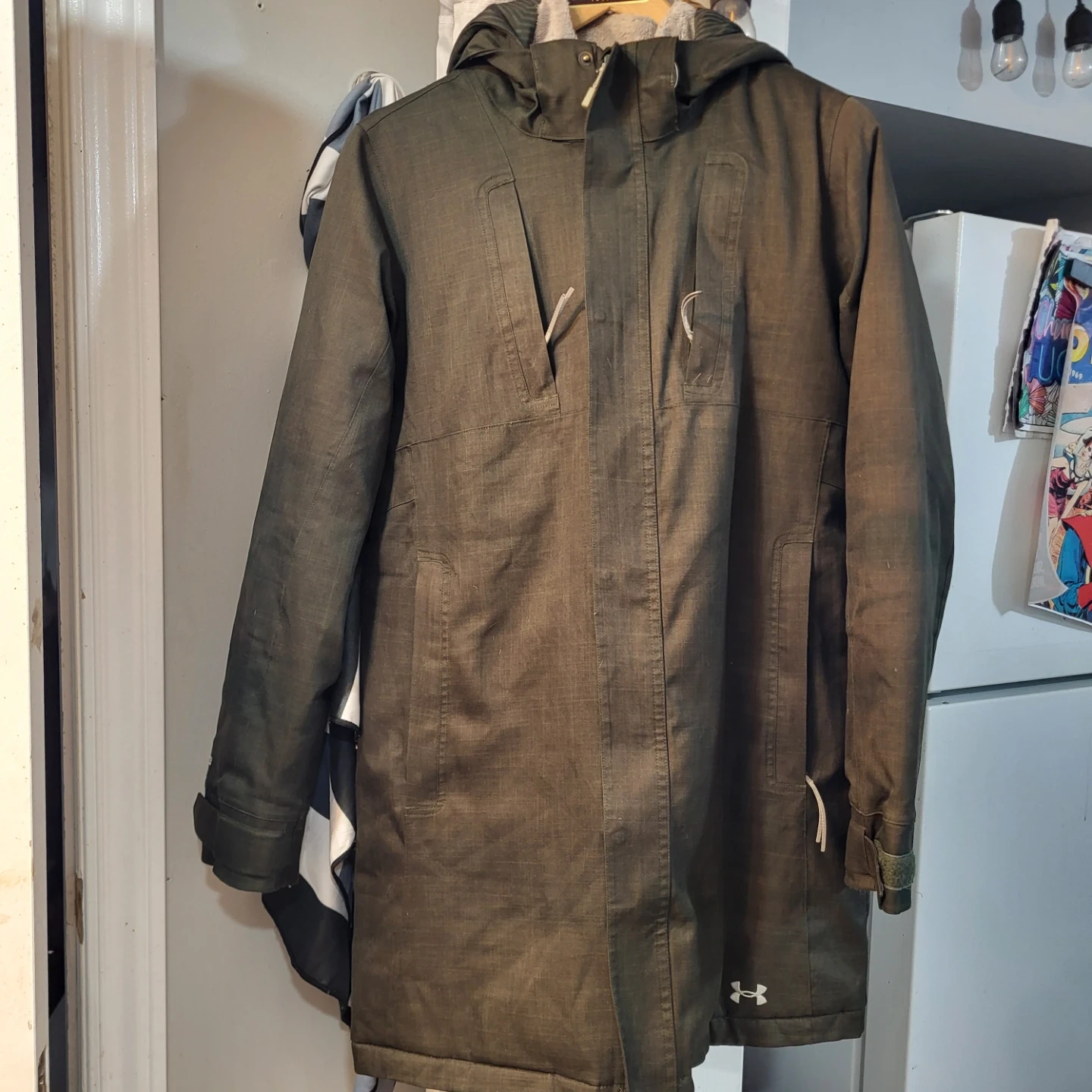 This Under Armour jacket is waterproof and windproof. It has multiple pockets and an adjustable hood. Great for staying dry during wet weather!